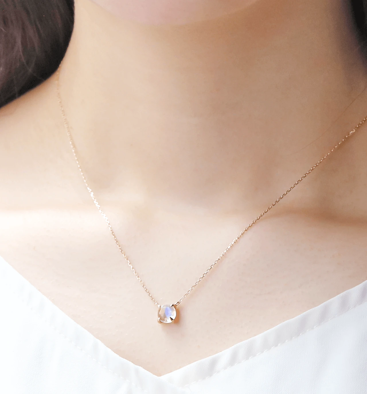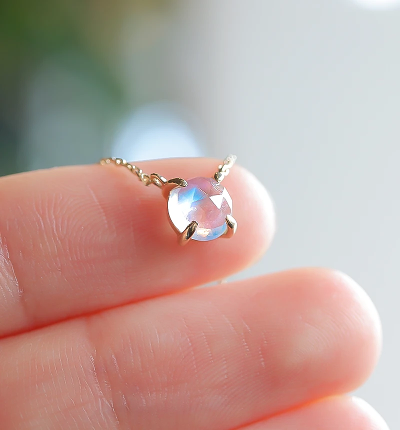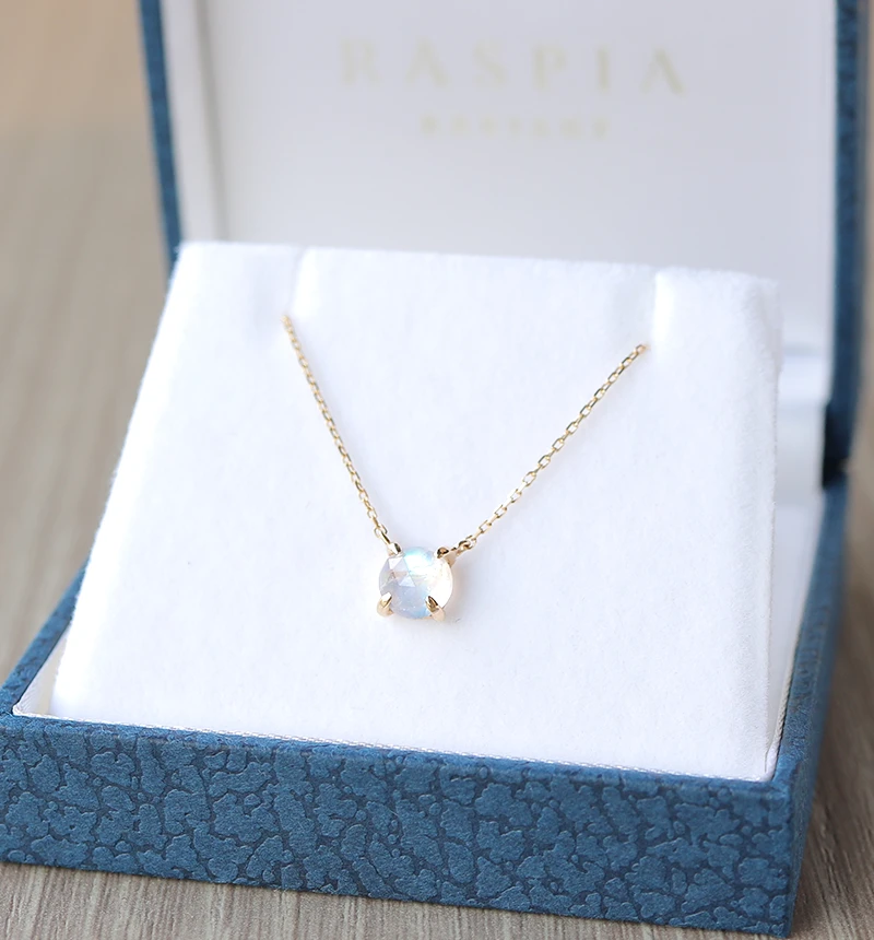 鮮やかなブルーのシラーが美しいローズカットのブルームーンストーンを使用したK10ネックレスです。ローズカットの表面に施された24面のカット面が光を反射し、キラキラと美しく輝きます。ブルームーンストーンは6月の誕生石です。