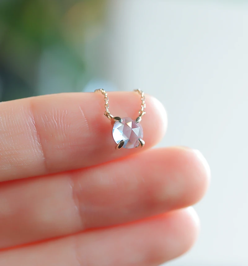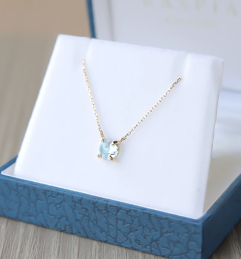 涼やかなブルーの発色と煌きが美しいローズカットのスカイブルートパーズを使用したK10ネックレスです。ローズカットの表面に施された24面のカット面が光を反射し、キラキラと美しく輝きます。スカイブルートパーズは11月の誕生石です。