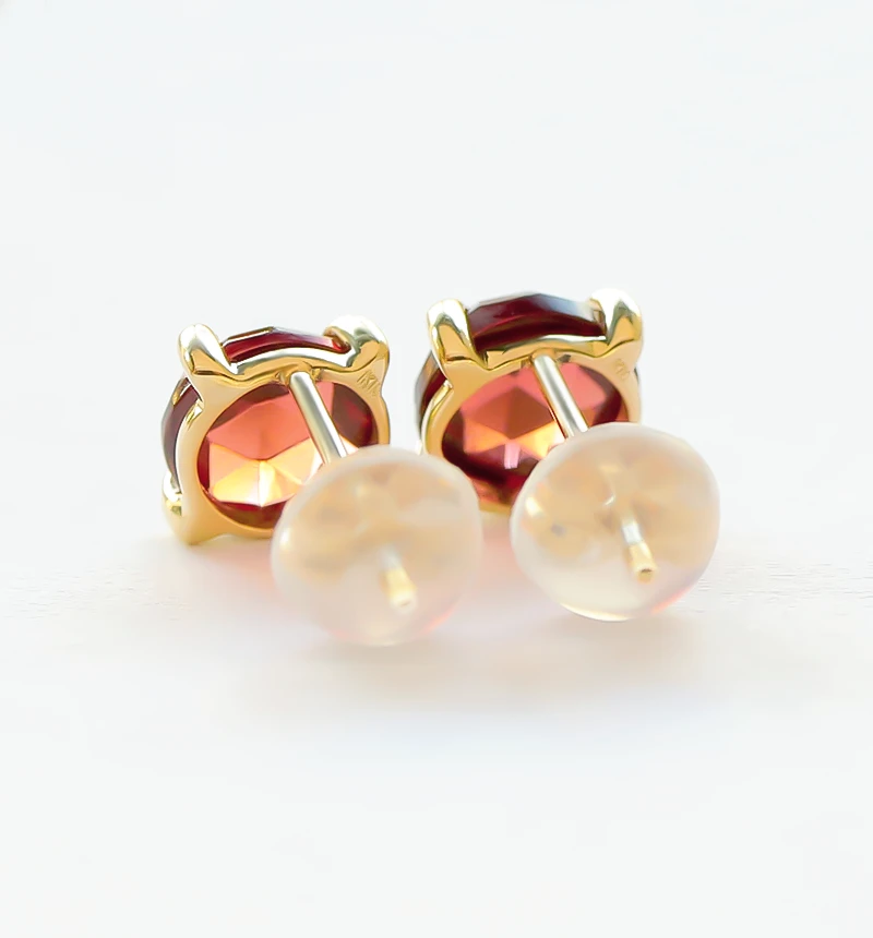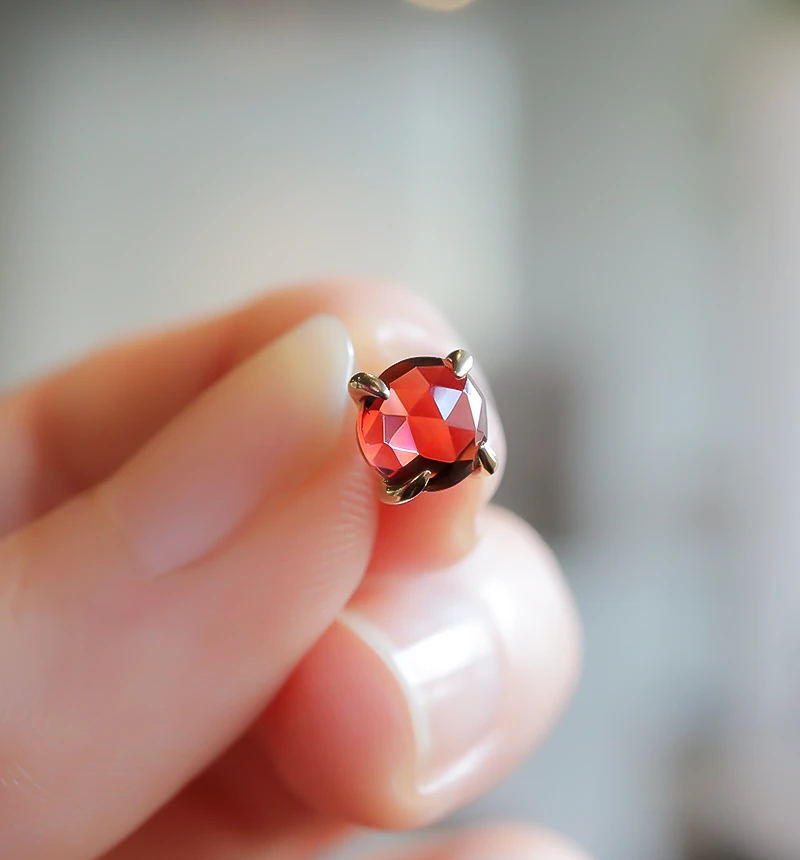 特有のレッドカラーが魅力的なローズカットのガーネットを使用したK10ポストピアスです。ローズカットの表面に施された24面のカット面が光を反射し、キラキラと美しく輝きます。ガーネットは1月の誕生石です。