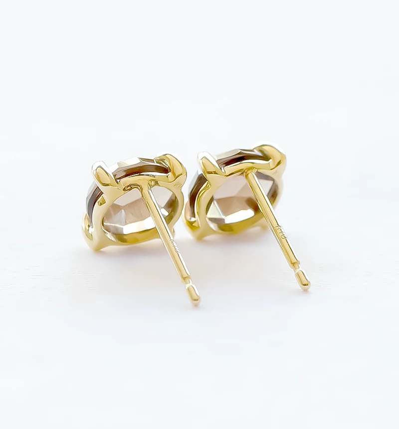 アンニュイな雰囲気漂い、上品な色合いが特徴であるローズカットのスモーキークォーツを使用したK10ポストピアスです。ローズカットの表面に施された24面のカット面が光を反射し、キラキラと美しく輝きます。