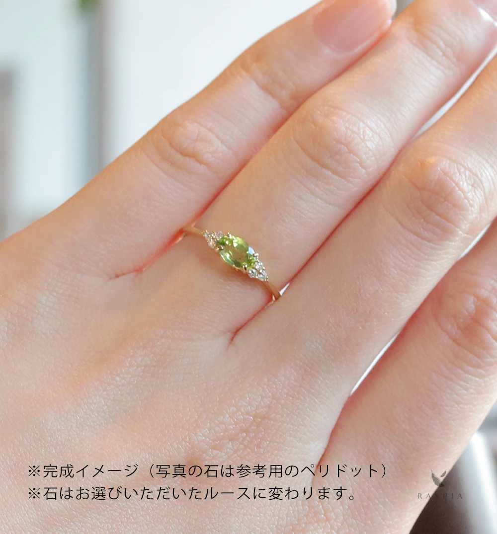 石が主役になる、そして鮮やかなカラーストーンの美しいきらめきが楽しめるリングになるように、細部までこだわり作り上げています。メイン石の左右に配置されたダイヤモンドがさらに気品とジュエリーの魅力を引き立たせます。指輪の重ね付けをしたり、Elloシリーズのネックレスと合わせたりと様々なコーディネートでお楽しみください。