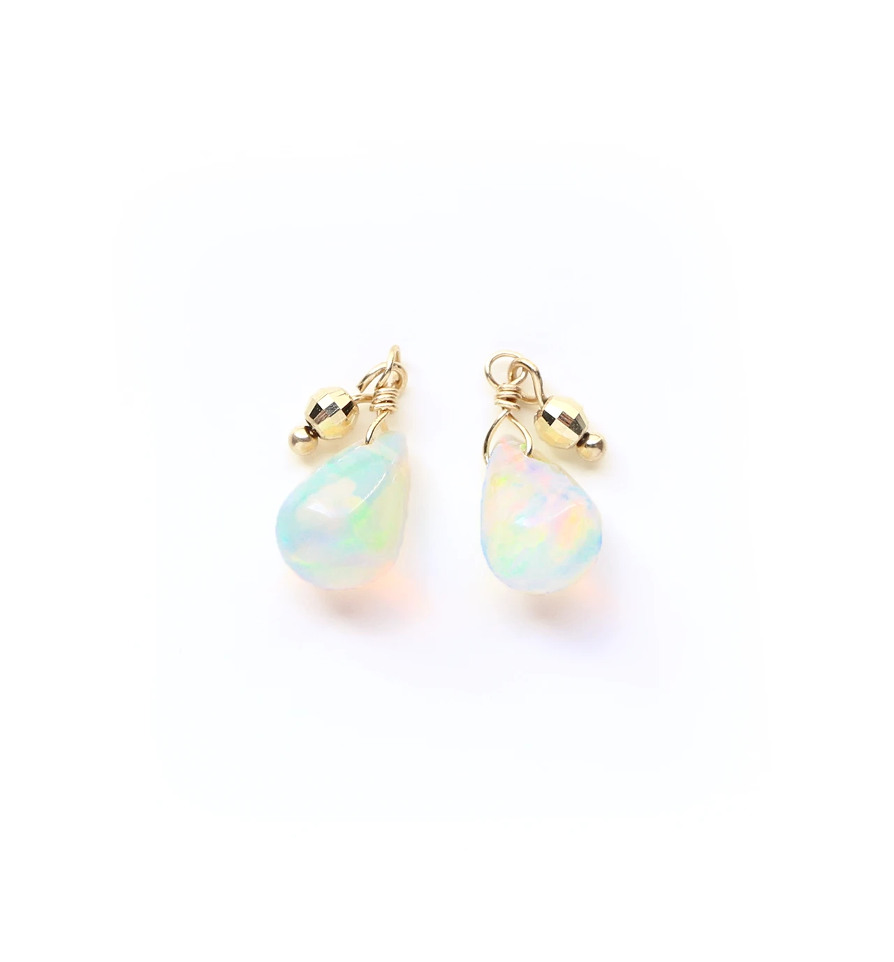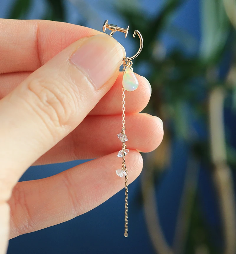 つるんとした透き通るホワイトに色とりどりの光を見せるオパールを使用したイヤリング。シンプルな中にのぞく可愛さがいつもと違う一面を演出してくれます。