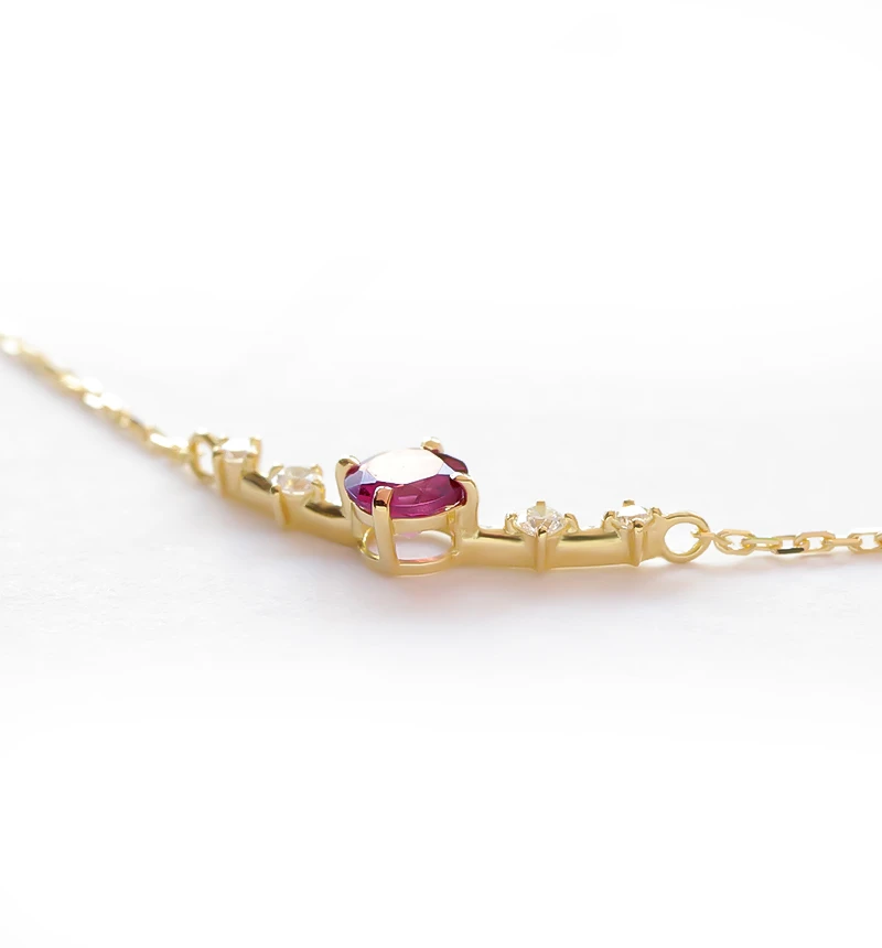 カシスや赤ワインのような深い色合いを最大限に引き立てるロードライトガーネットは、2種類のガーネットの成分が混ざりあって生まれた赤紫色のガーネットです。ネックレストップの石留めは、極限まで小さくさり気ない作りにこだわりました。小さいながらもしっかりと石を支え、宝石の存在感を引き立てます。 金具はすべて18金で、職人が細部まで丁寧に磨きあげました。鮮やかなイエローゴールドの輝きを長くお楽しみいただけます。
