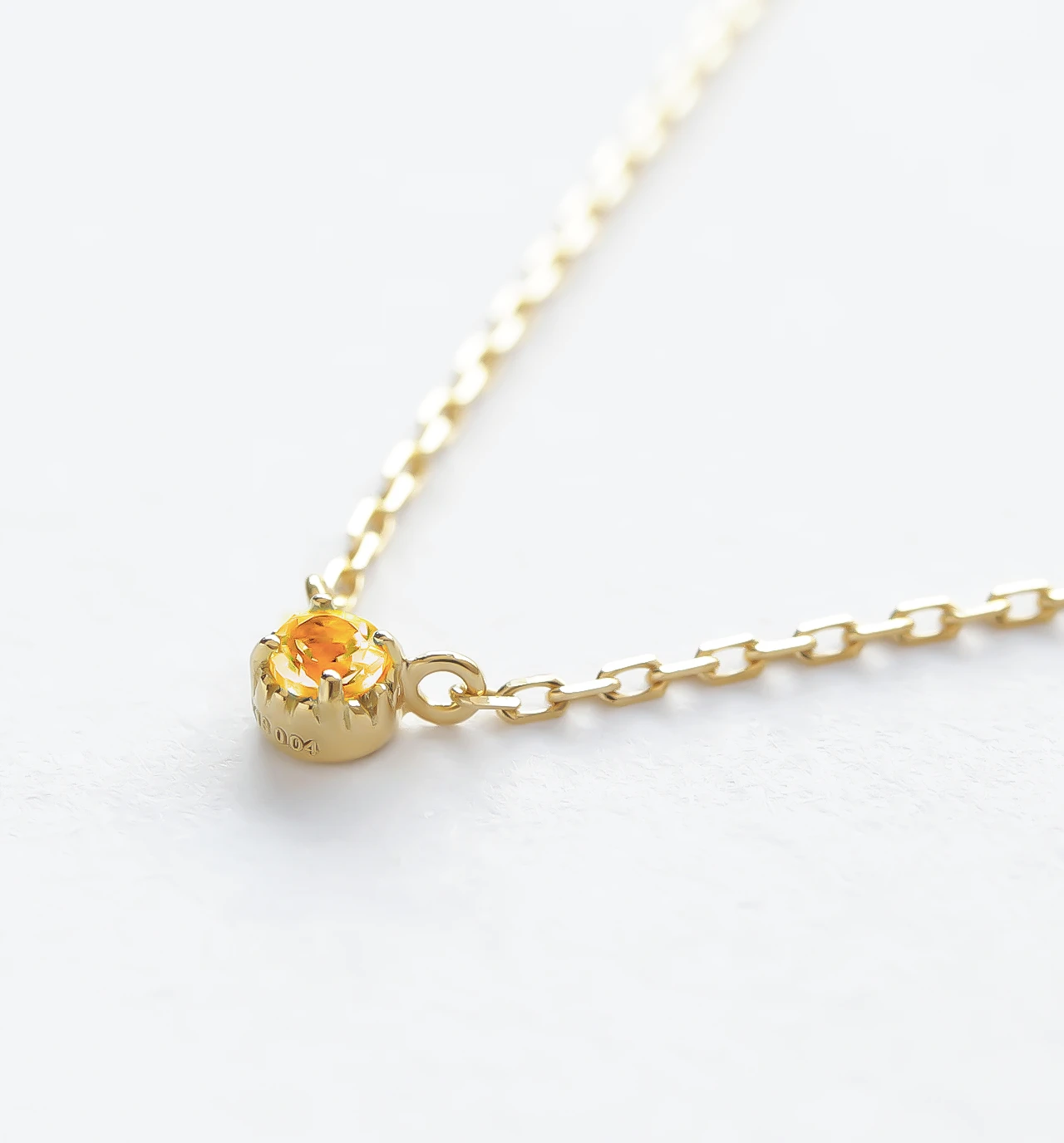 明るく輝く黄色が美しいイエローサファイアを使用したK10(10金)のネックレスです。イエローサファイアは、ゴールドに近いものからパステルカラーのようなものまで様々な色合いあります。その中でも品質の高いとされる、黄色からオレンジがかった色味で鮮やかな彩度を持つイエローサファイアを使用しました。