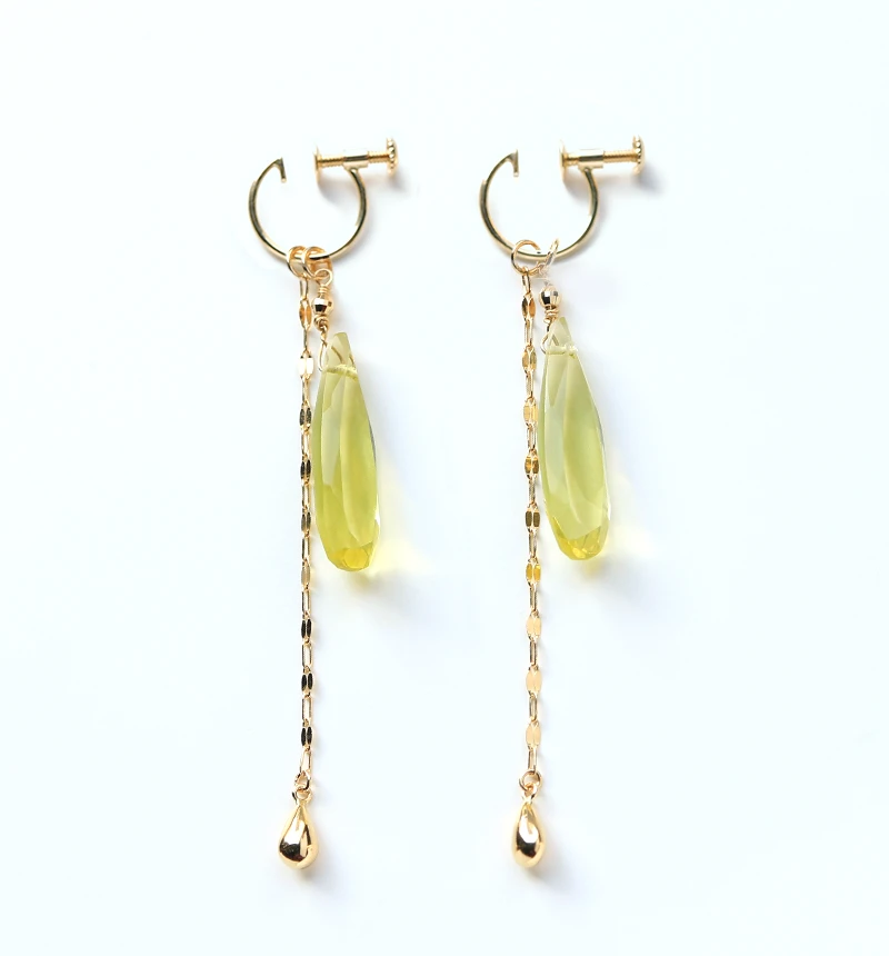| サイズ | 【イヤリング】サイズ:直径10mm×太さ0.7mm【石】レモンクォーツ:約20mm×6mm【チェーン】約46mm【チャーム丸カン内径】約2mm | ||