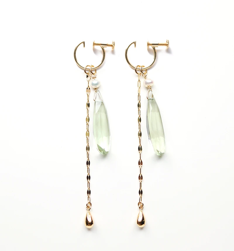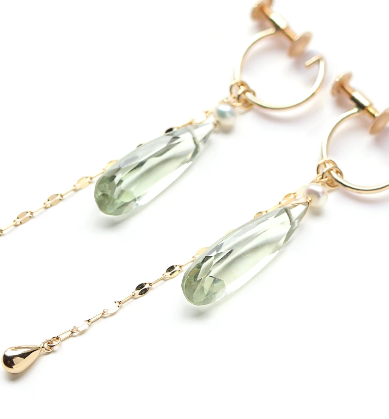 縦長のグリーンアメジストとチェーンが耳元で揺れるたびに軽やかに煌めきます。また、鮮やかなイエローゴールドと清々しい色のグリーンアメジスト、そしてさり気なくあしらわれた淡水パールは相性がよく、上品な可愛らしさを演出してくれます。