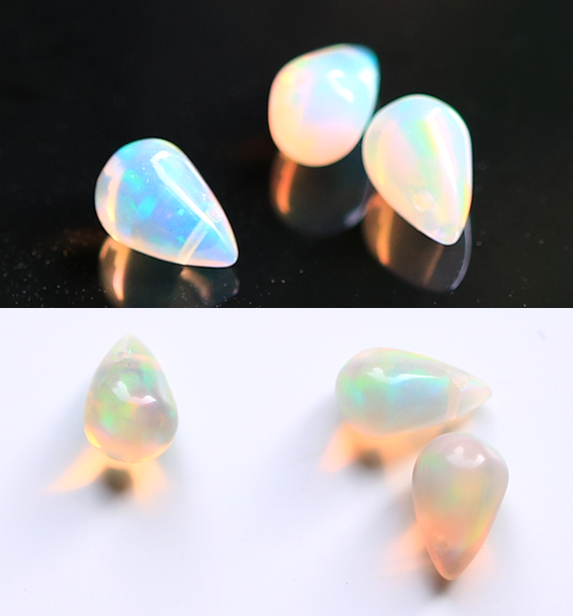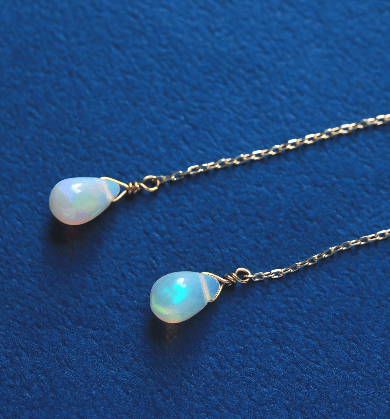 つるんとした透き通るホワイトに色とりどりの光を見せるオパールを使用したピアス。