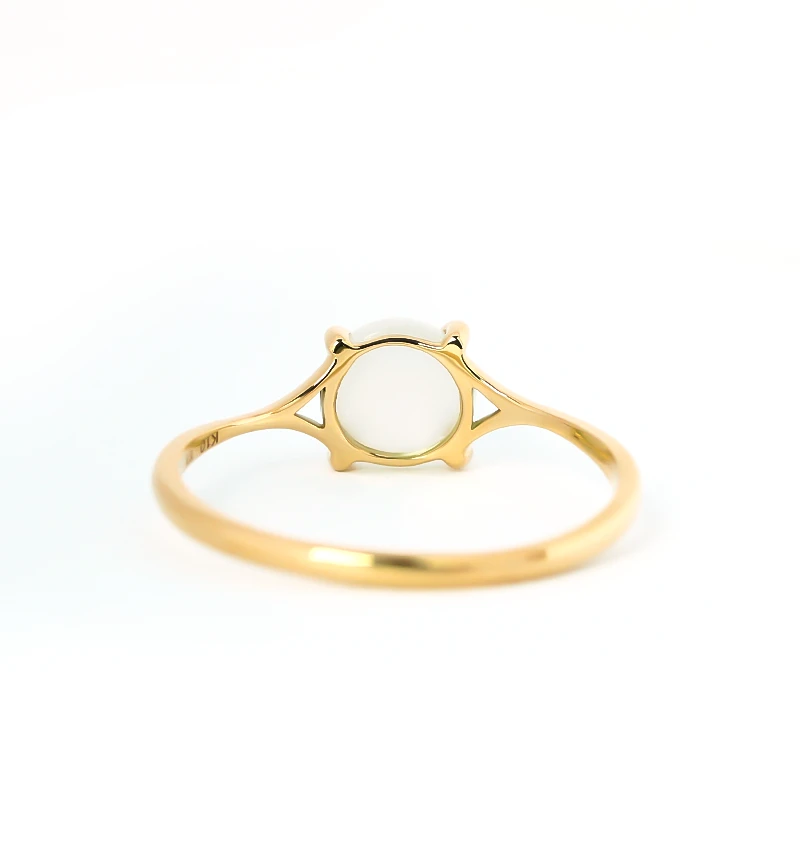 乳白色の中にほのかに光る青いシラーが美しい、ローズカットのホワイトムーンストーンを使用したK10リングです。ローズカットの表面に施された24面のカット面が光を反射し、キラキラと美しく輝きます。ムーンストーンは6月の誕生石です。
