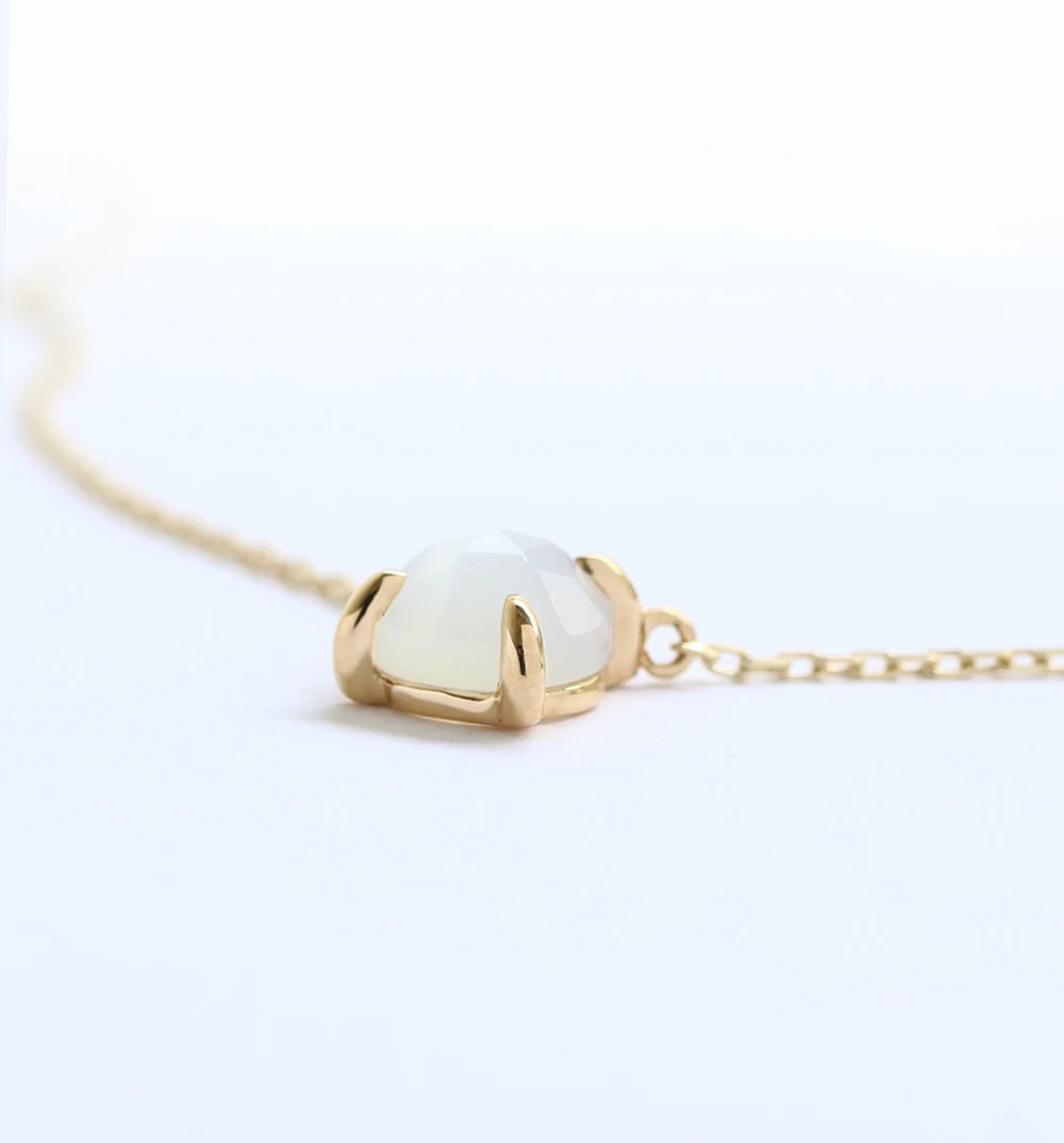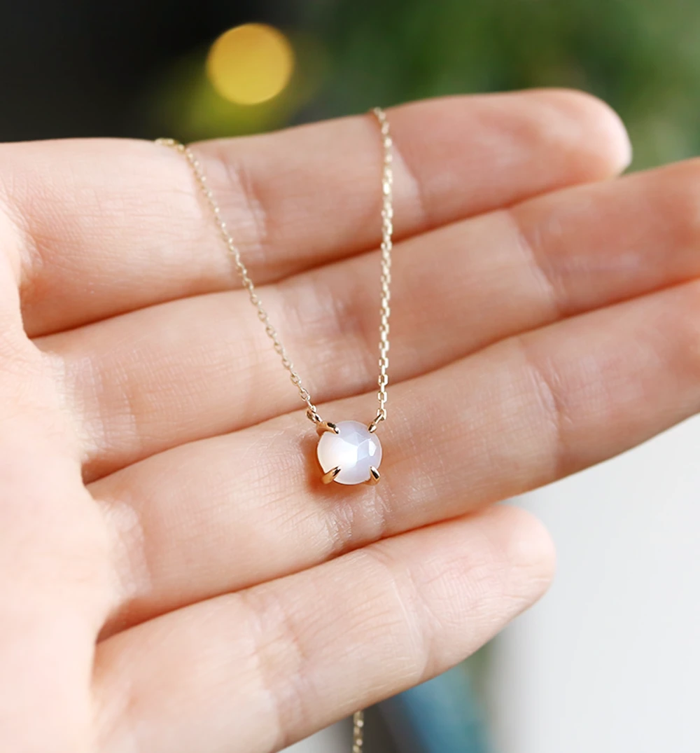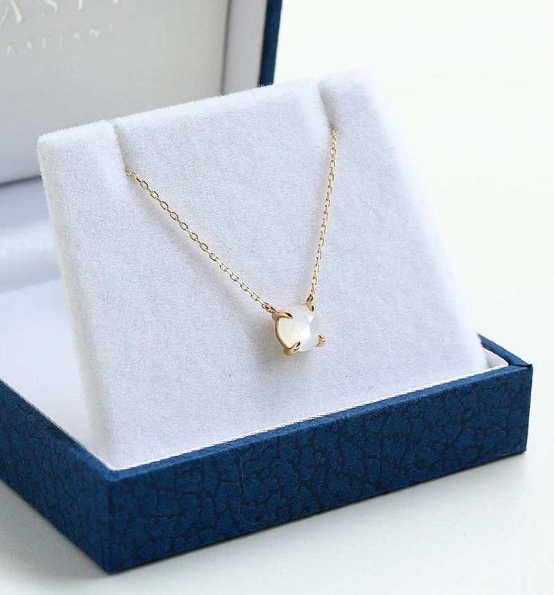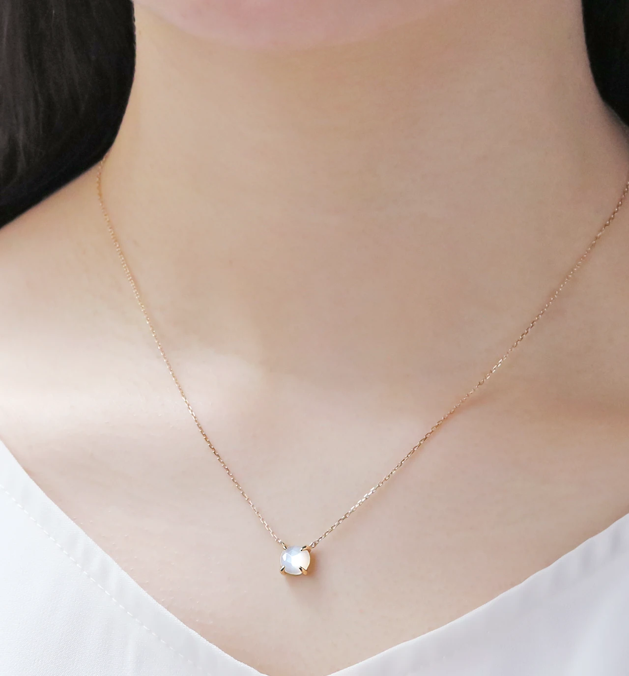 クリアな純白のシラーが美しいローズカットのホワイトムーンストーンを使用したK10ネックレスです。ローズカットの表面に施された24面のカット面が光を反射し、キラキラと美しく輝きます。ムーンストーンは6月の誕生石です。