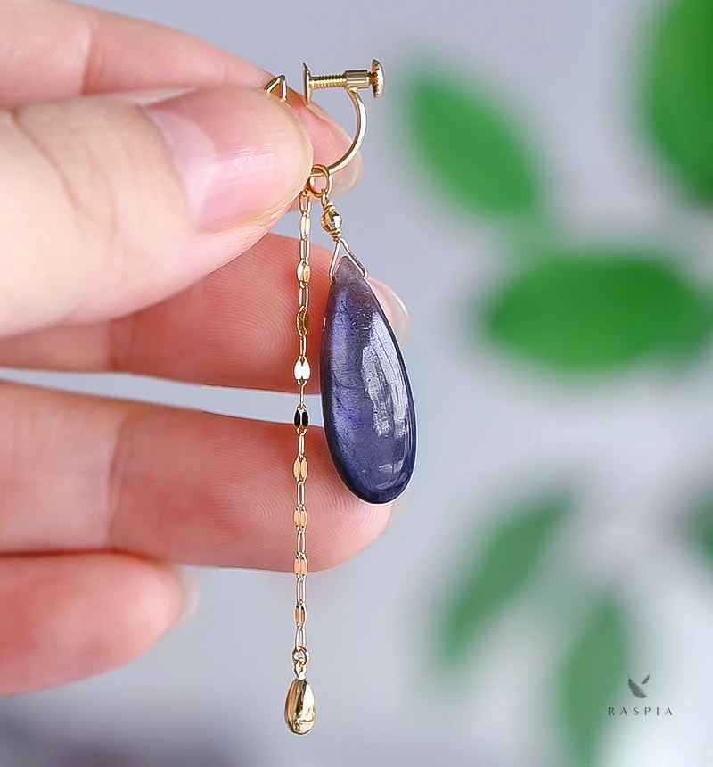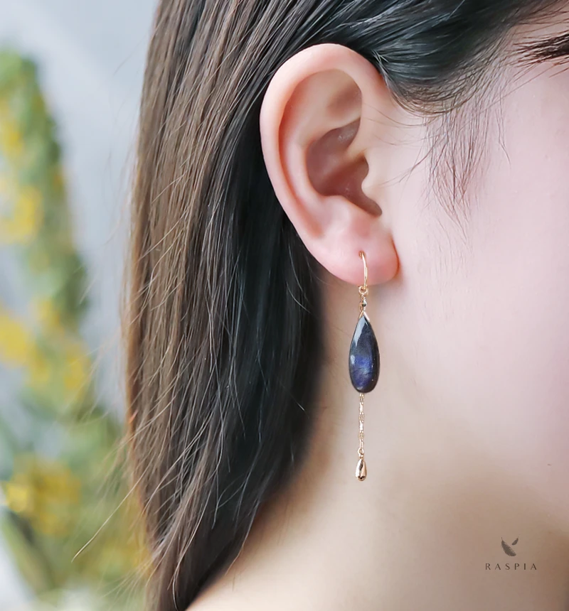 スペクトロライトの深い黒とのコントラストの美しさが最大限に引き立つようにしました。北極のオーロラを思わせるスペクトロライト、そしてさり気なくあしらわれたK18のカットビーズは相性がよく、上品で可愛く耳元で揺れます。