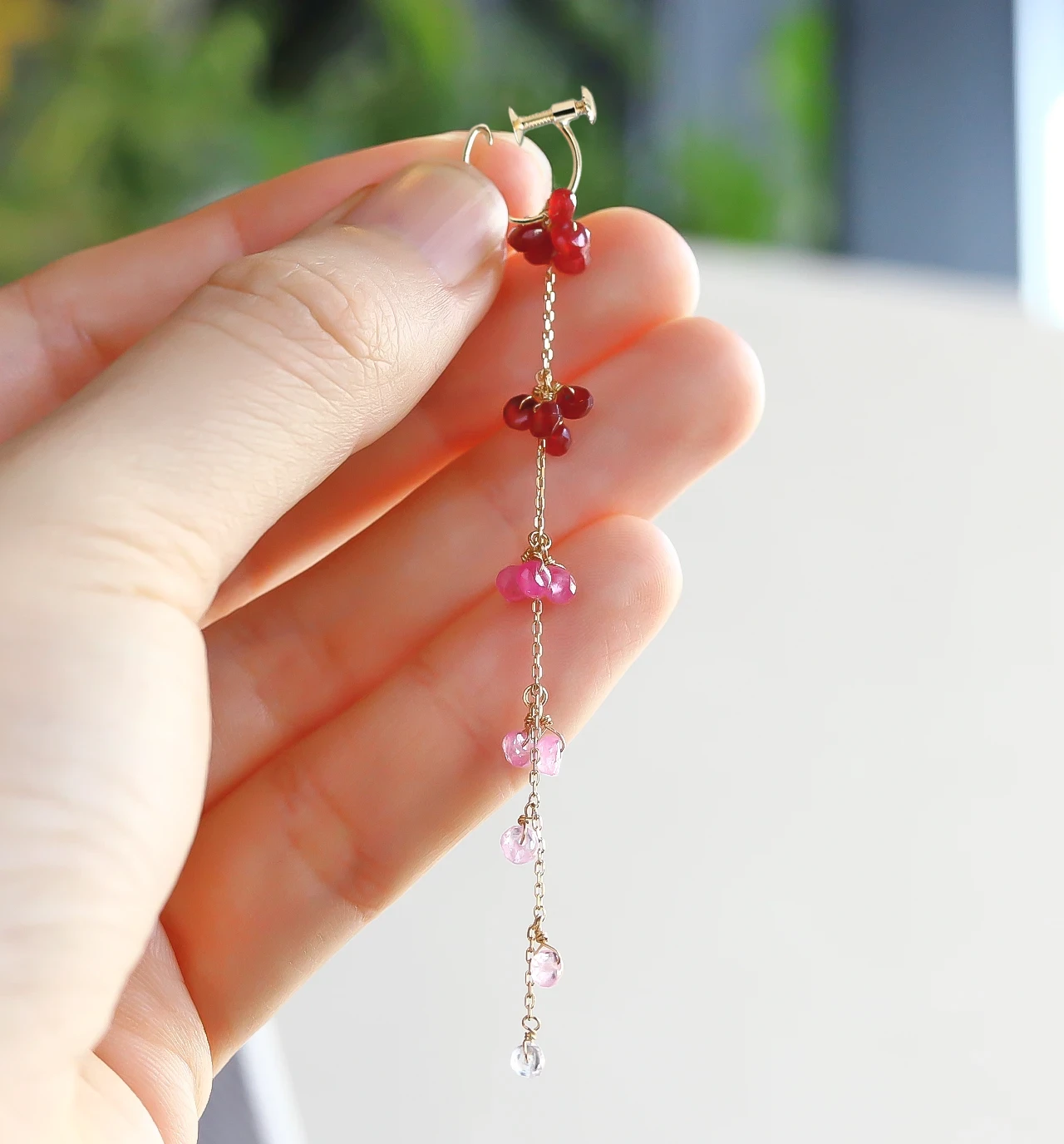 レッドカラーグラデーションのルビーを贅沢に使用した、ロングチェーンのK10イヤリングです。