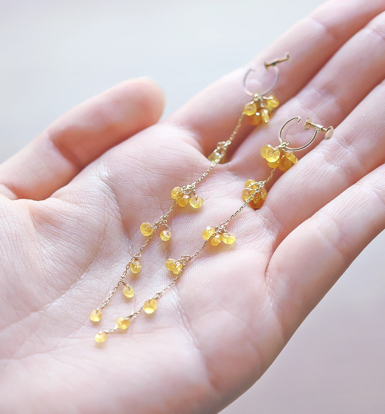 イエローカラーのサファイアを贅沢に使用した、ロングチェーンのK10イヤリングです。