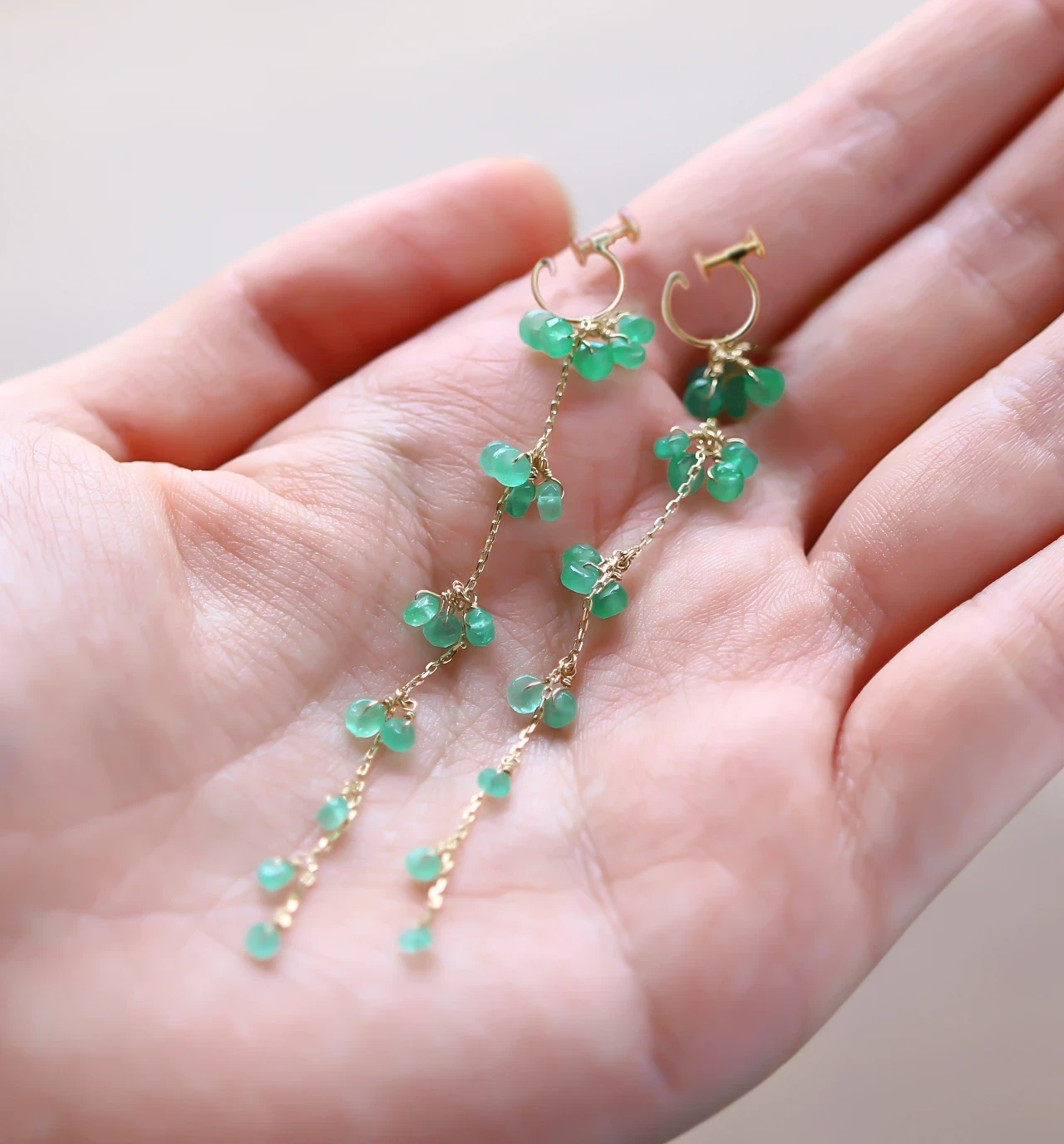 ロングチェーンに多くの美しいエメラルドがついたデザインは、顔まわりを華やかにしつつも、縦のラインが強調されフェイスラインをすっきりと見せてくれます。