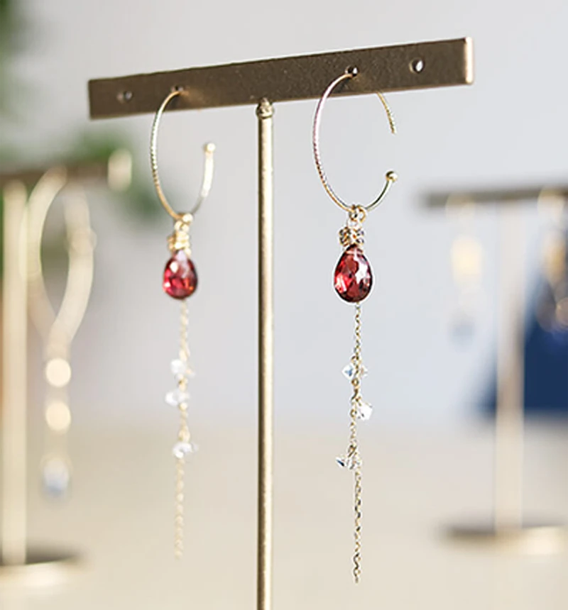 シックな赤のアルマンディンガーネットに透明のハーキマーダイヤモンドを使用したピアス。深い赤色は大人の女性の魅力をより引き立たせ、アクセントの透明の輝きでピュア感もプラス。