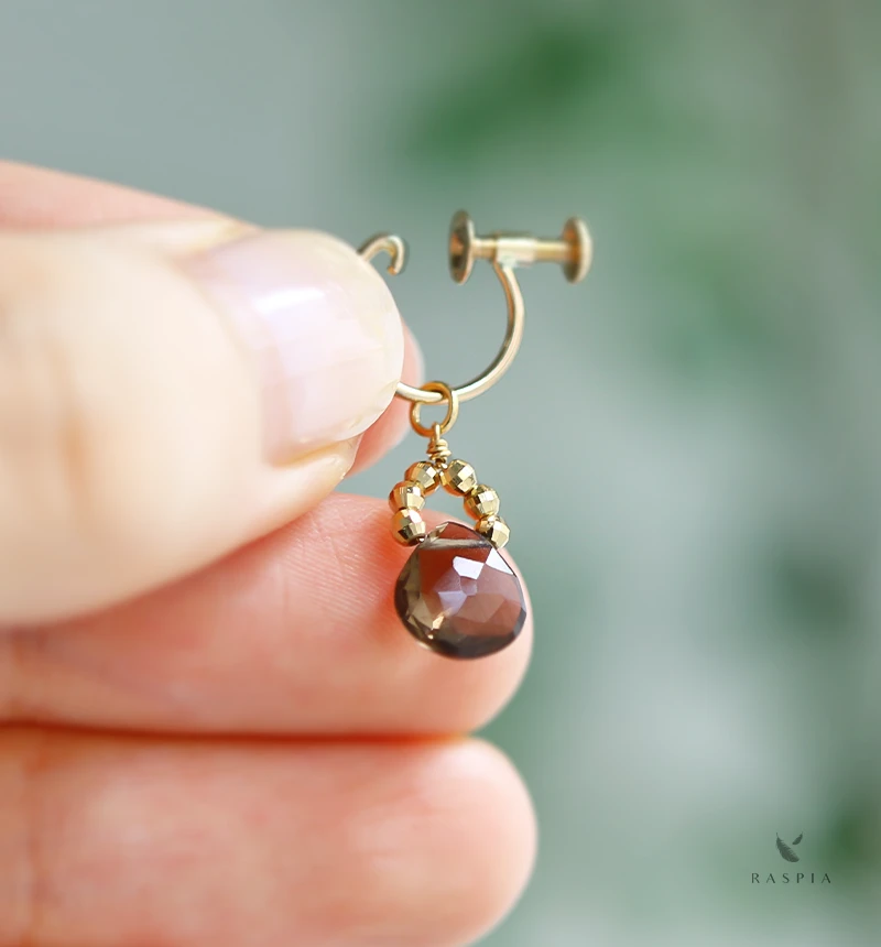 | サイズ | 【イヤリング】サイズ:直径10mm×太さ0.7mm【石】スモーキークォーツ:約7mm×8mm【チャーム丸カン内径】約2mm | ||
