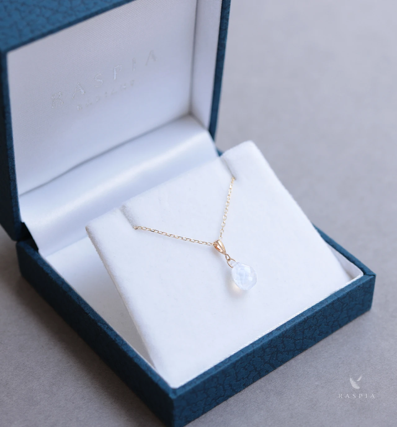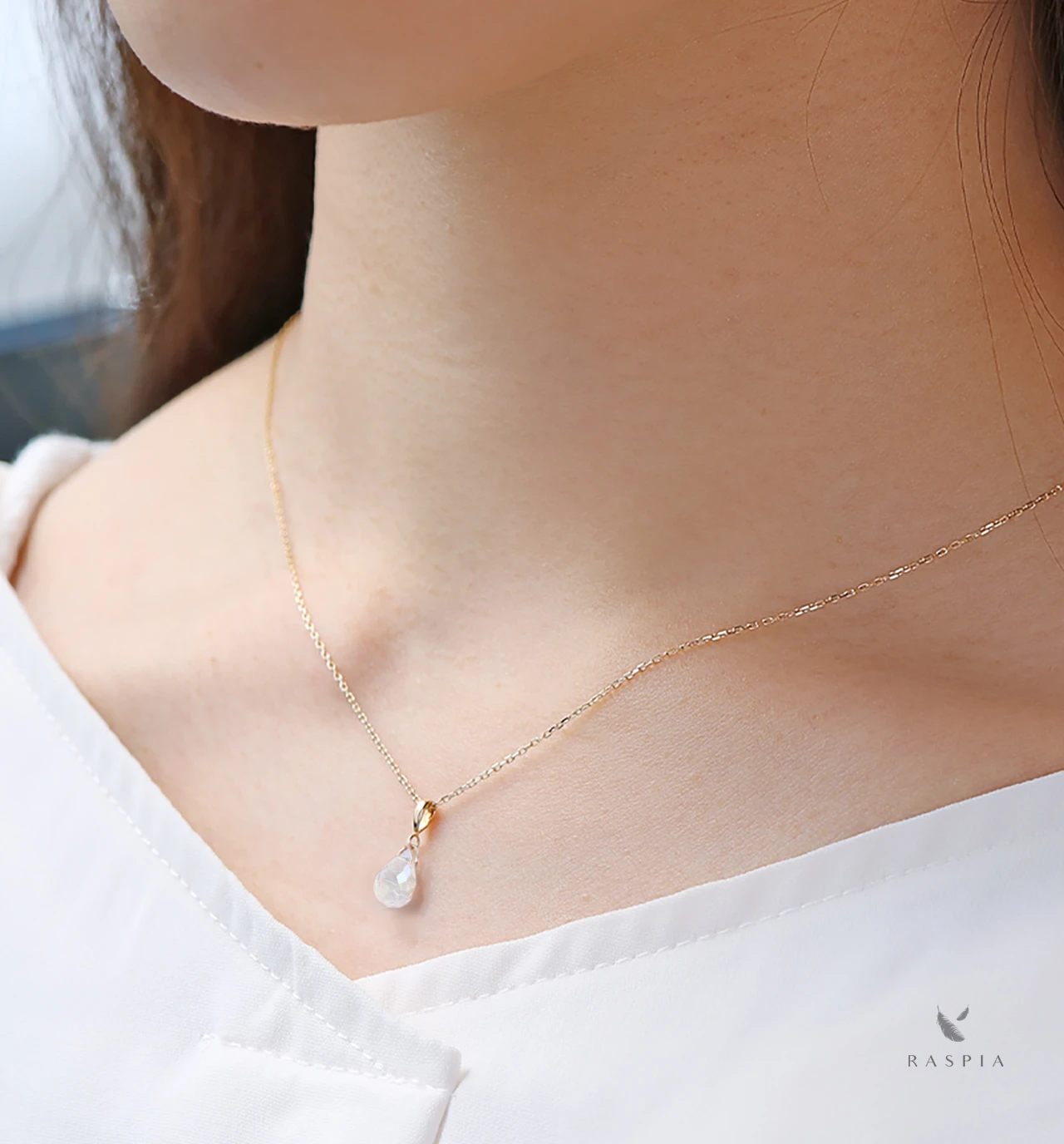 ブリオレットカットのムーンストーンが胸元で確かな存在感を放つ、ネックレスチャームです。金具は石の存在を引き立てるサイズ感にこだわりました。また、身体の動きに合わせ石が揺れてきらめき、それでいて石がいつも正面を向くように絶妙なバランス調整を施しています。