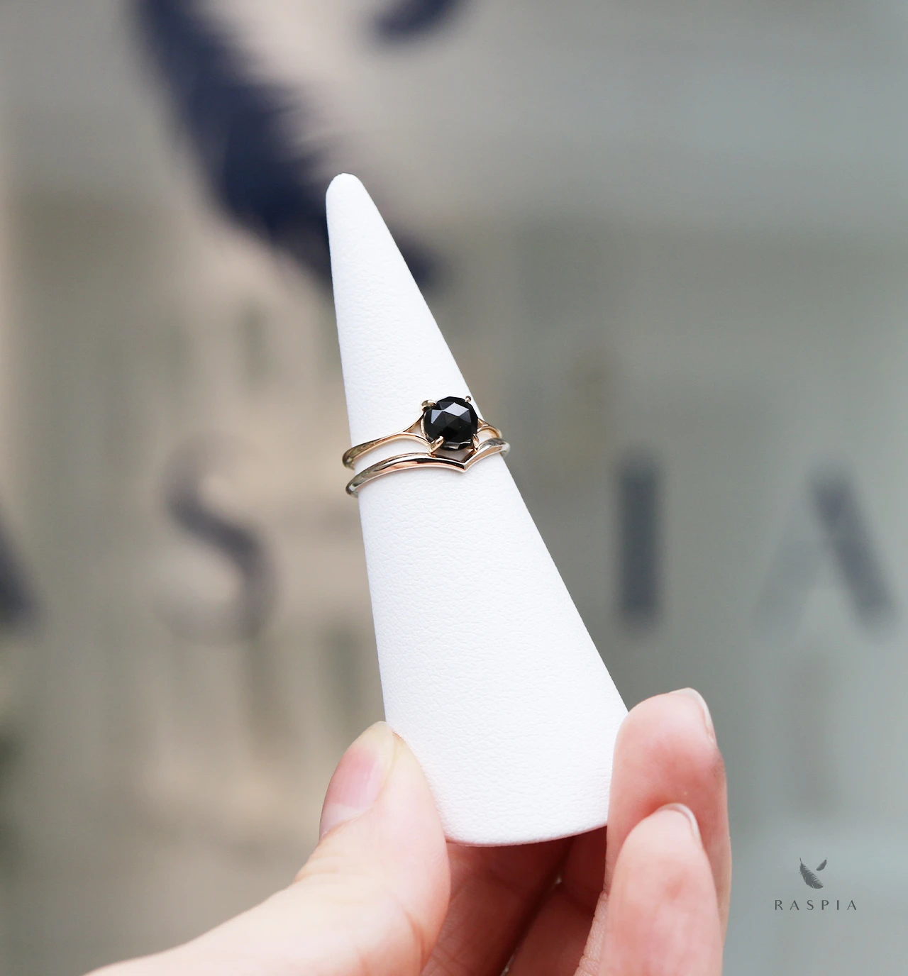 大人な印象のブラックスピネルを使用したK10リングです。ローズカットの表面に施された24面のカット面が光を反射し、キラキラと美しく輝きます。スピネルは8月の誕生石です。