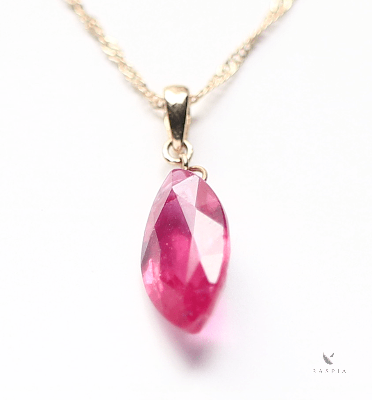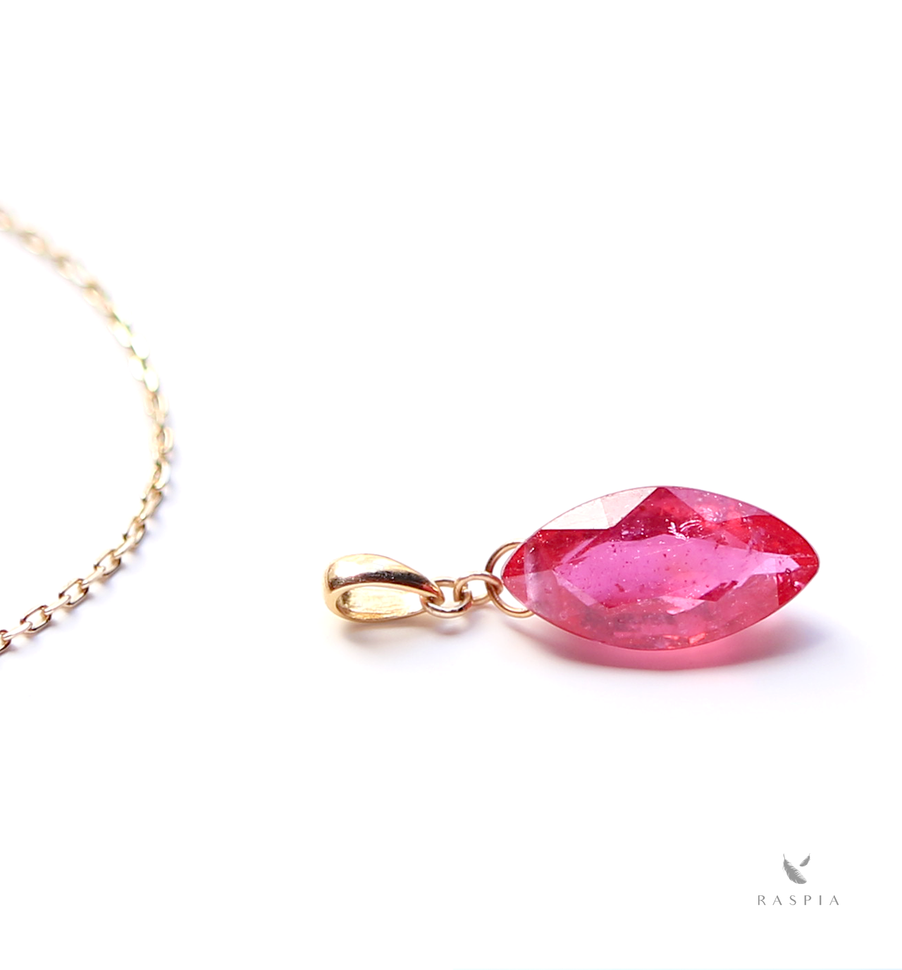 マーキスシェイプのルビーが胸元で確かな存在感を放ちます。金具は石の存在を引き立てるサイズ感にこだわりました。また、身体の動きに合わせ石が揺れてきらめき、それでいて石がいつも正面を向くように絶妙なバランス調整を施しています。