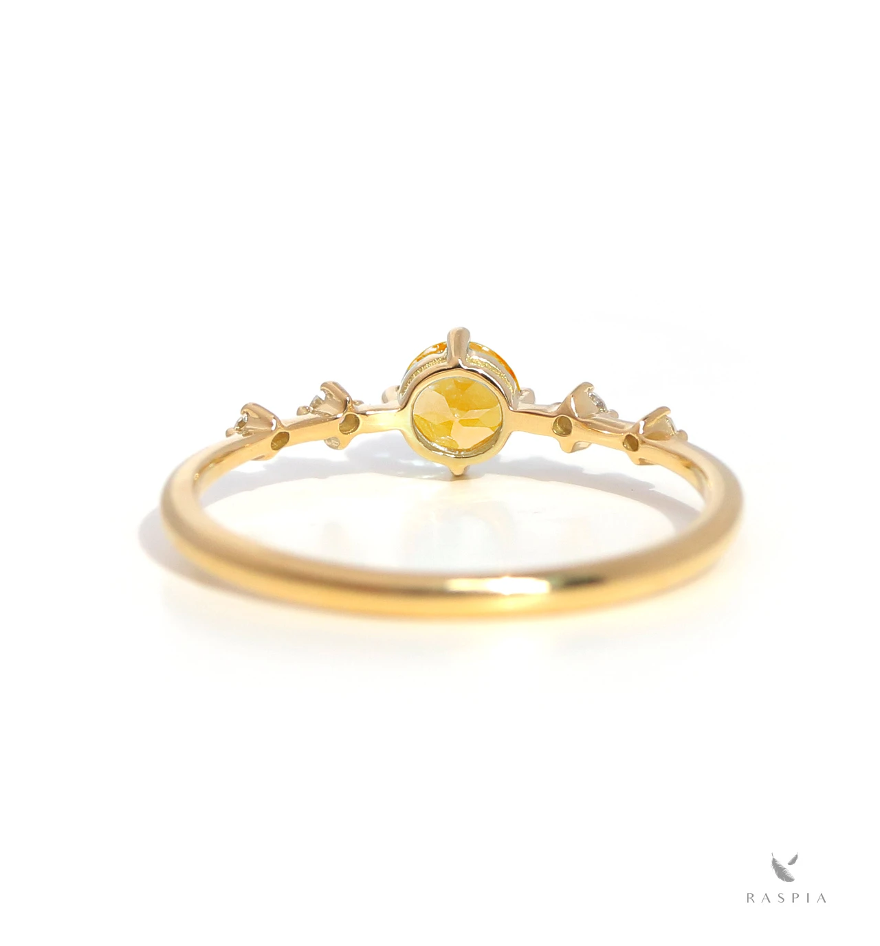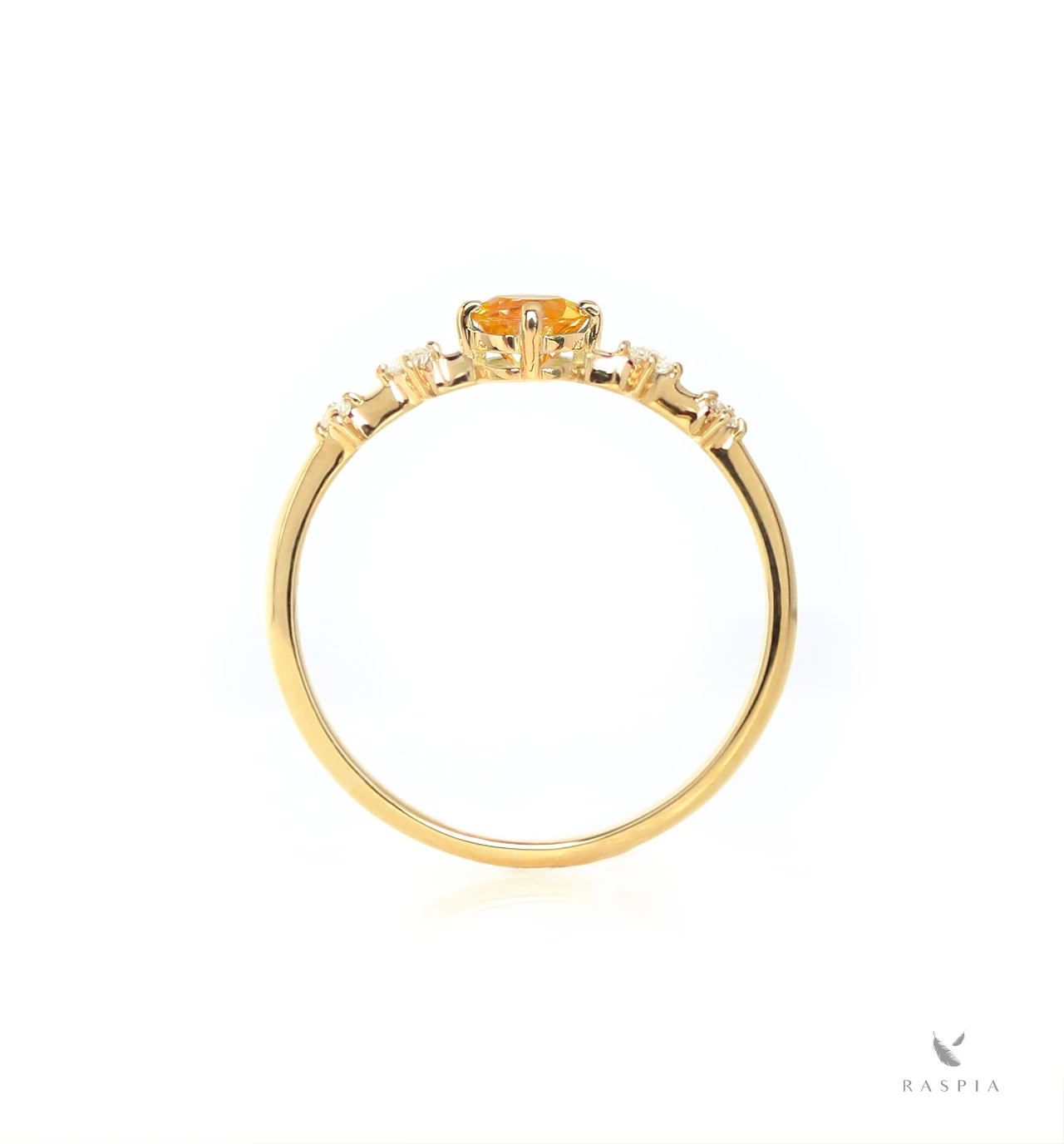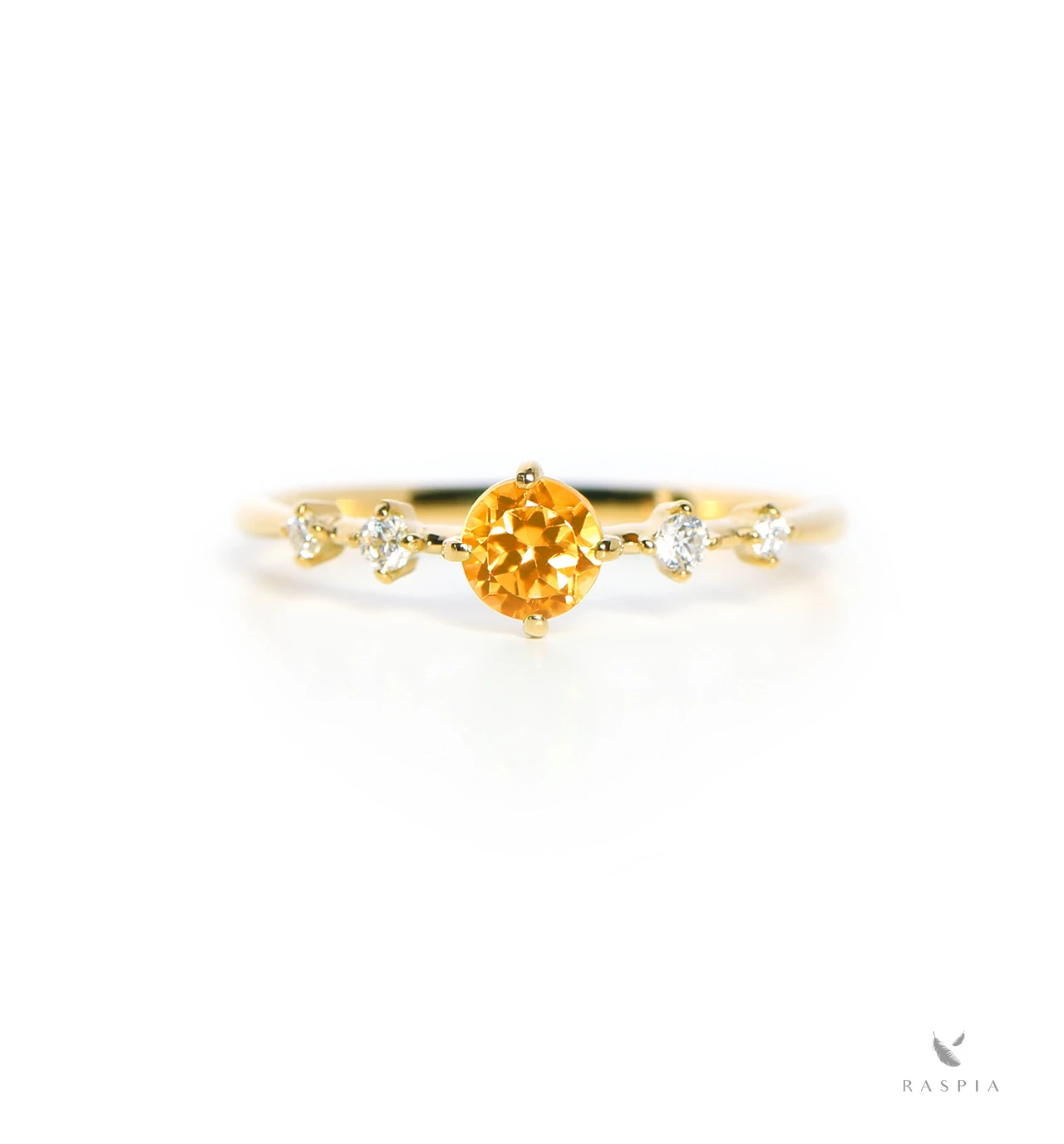 スペサルティンガーネットのラウンドカットをメインに、4つのメレダイヤを配したK18リングです。瑞々しい鮮やかなオレンジとダイヤモンドの輝きが美しく調和するアイテム。