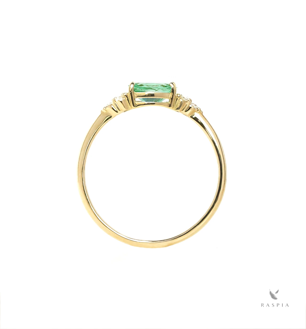 エメラルドのオーバルカットをメインに、6つのメレダイヤを左右にセットしたK18リングです。ずっと見続けていても飽きることがない、深く豊かなグリーンカラーが美しい宝石。エメラルドは5月の誕生石です。