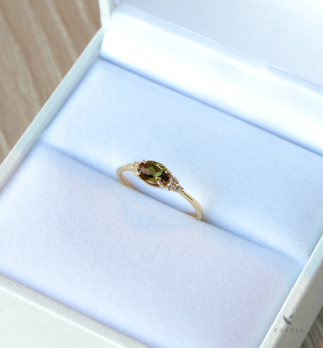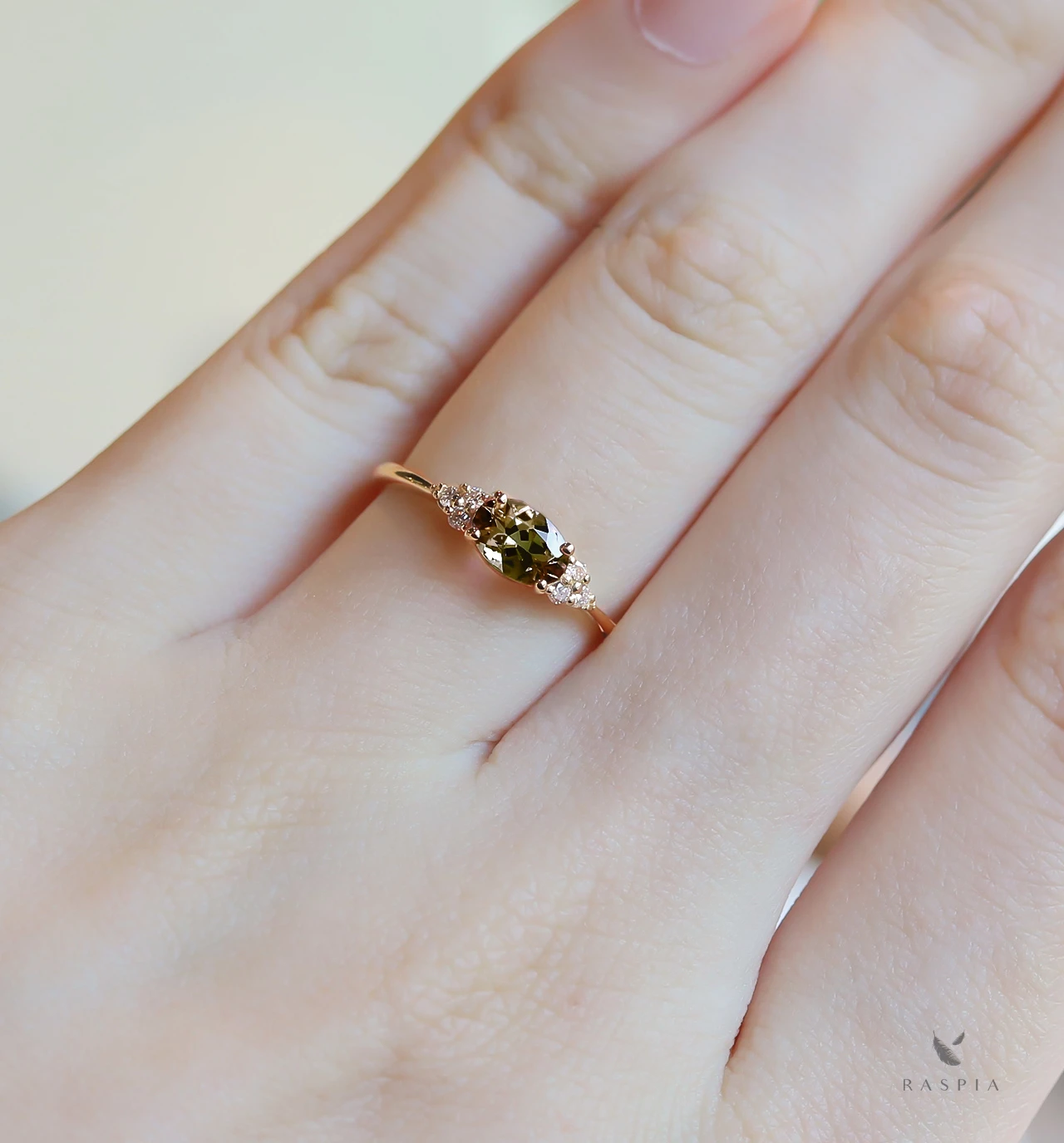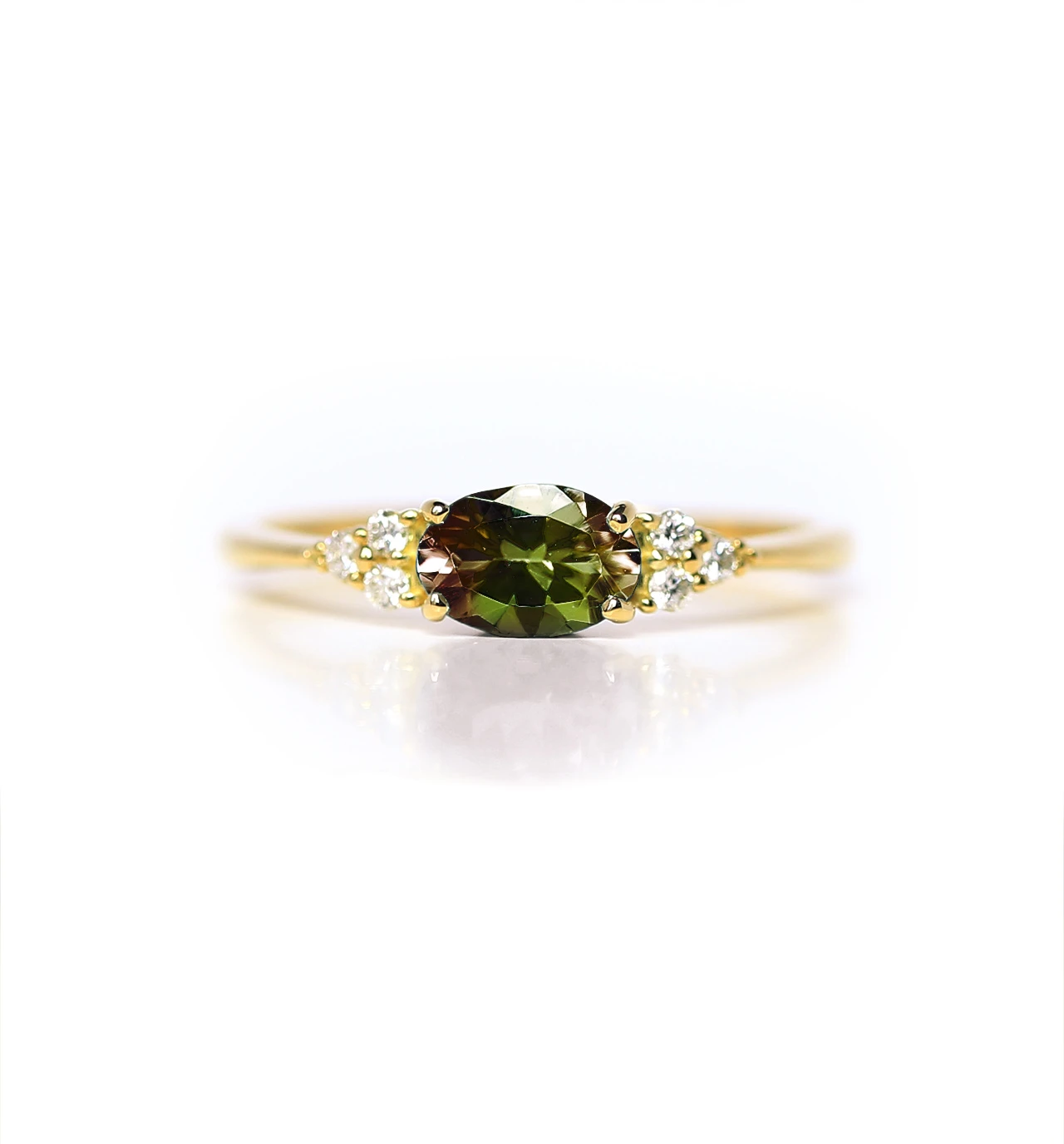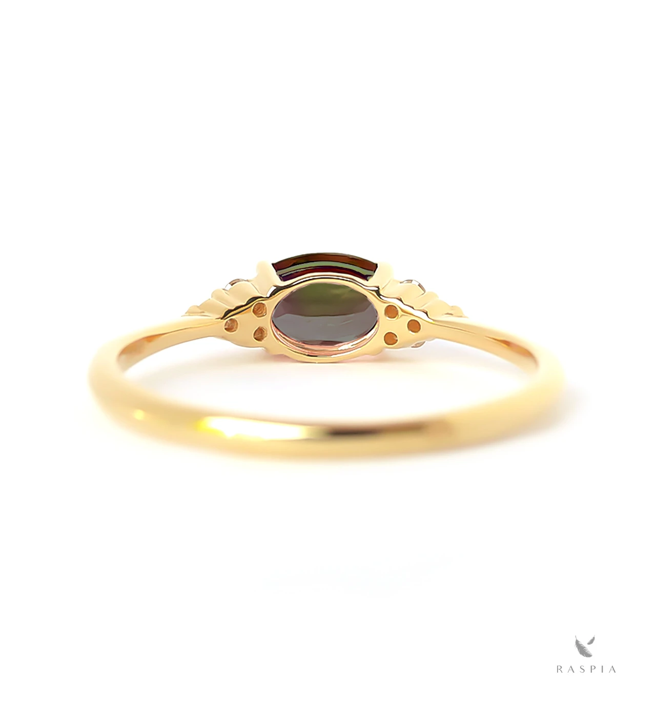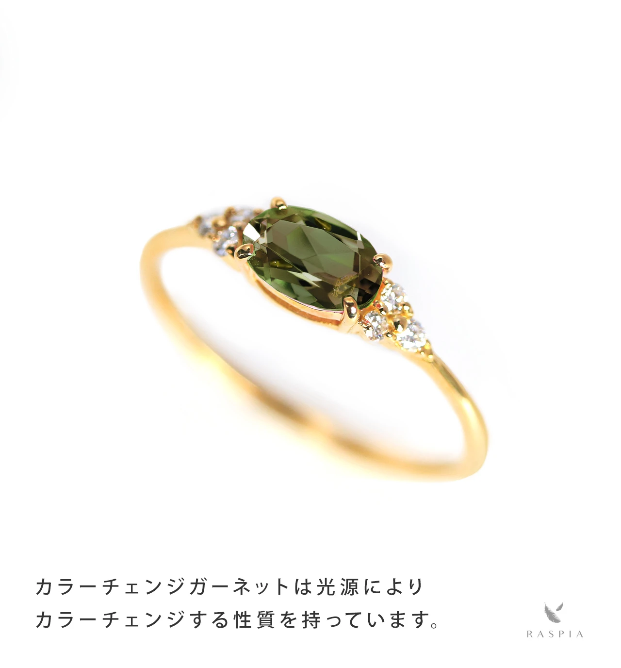 カラーチェンジガーネットのオーバルカットをメインに、6つのメレダイヤを左右にセットしたK18リングです。 カラーチェンジガーネットは、白熱灯のもとでは深いブラウン、蛍光灯下では鮮やかなレッドカラーに色彩が変化する石です。