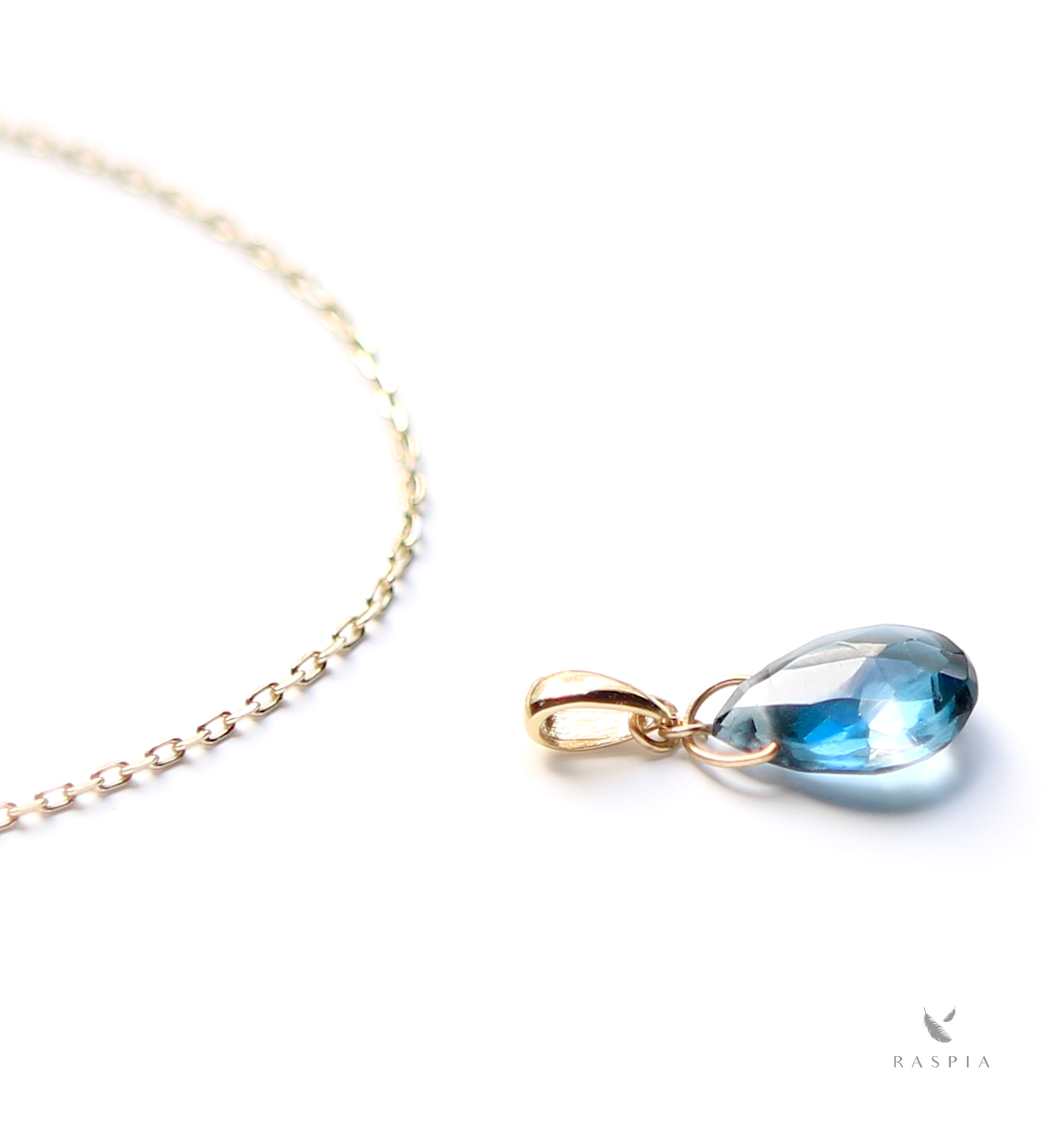 平ドロップのロンドンブルートパーズが胸元で確かな存在感を放ちます。金具は石の存在を引き立てるサイズ感にこだわりました。また、身体の動きに合わせ石が揺れてきらめき、それでいて石がいつも正面を向くように絶妙なバランス調整を施しています。