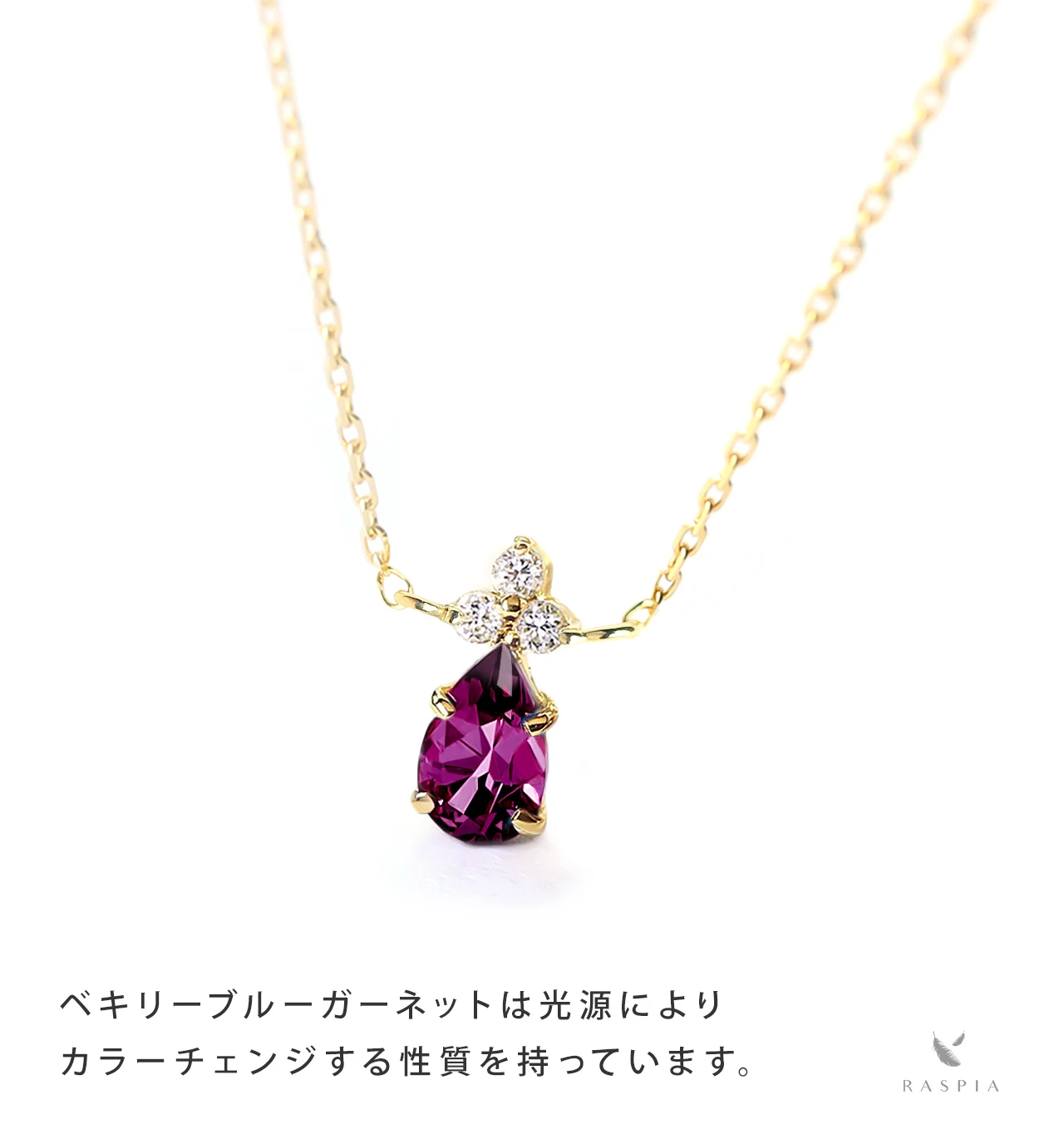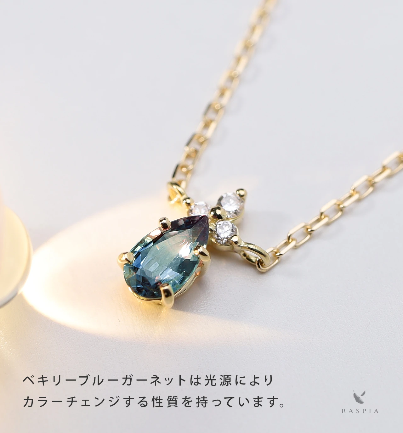カラーチェンジ効果を持つブルーカラーのガーネットとダイヤモンドを使用したネックレス。太陽の光の下では深いブルー、ろうそくのような白熱灯などの元では赤い色合いへと表情を変えます。その美しい輝きは大人の女性の魅力をより引き立たせます。その魅力を楽しめるよう、カラー、カット・研磨の質、透明度など、美しいルースを1粒ずつ厳選して買付しております。