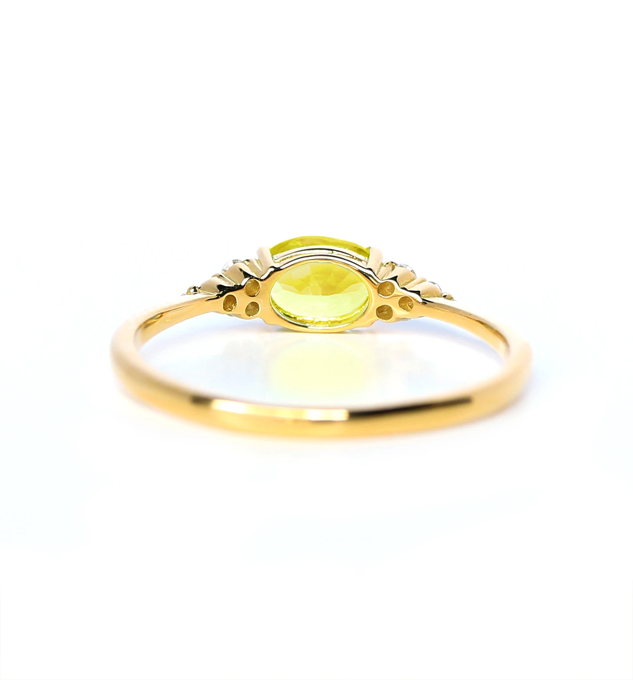 イエローサファイアのオーバルカットをメインに、6つのメレダイヤを左右にセットしたK18リングです。明るく輝く黄色が美しいイエローサファイアとダイヤモンド、ゴールドの金具の色合いが美しく調和し、華やかで上品な印象を与えてくれます。イエローサファイアは9月の誕生石です。