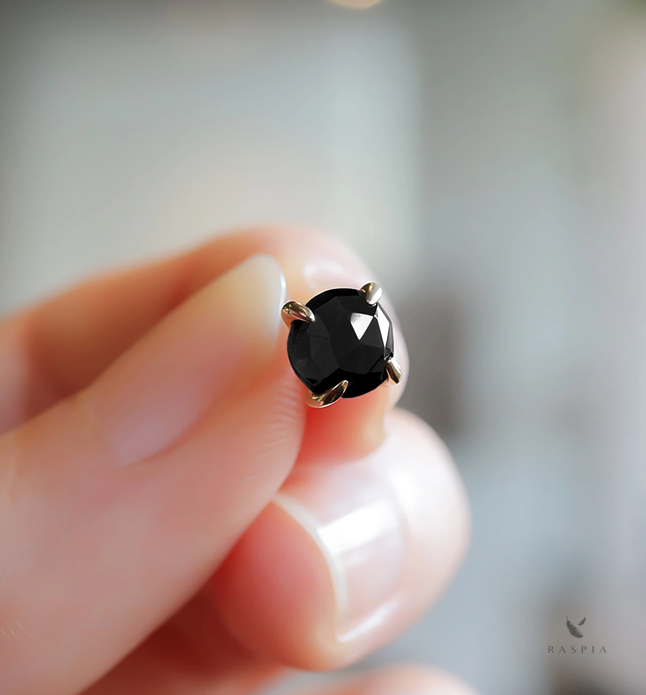 大人な印象のブラックスピネルを使用したK10ポストピアスです。ローズカットの表面に施された24面のカット面が光を反射し、キラキラと美しく輝きます。