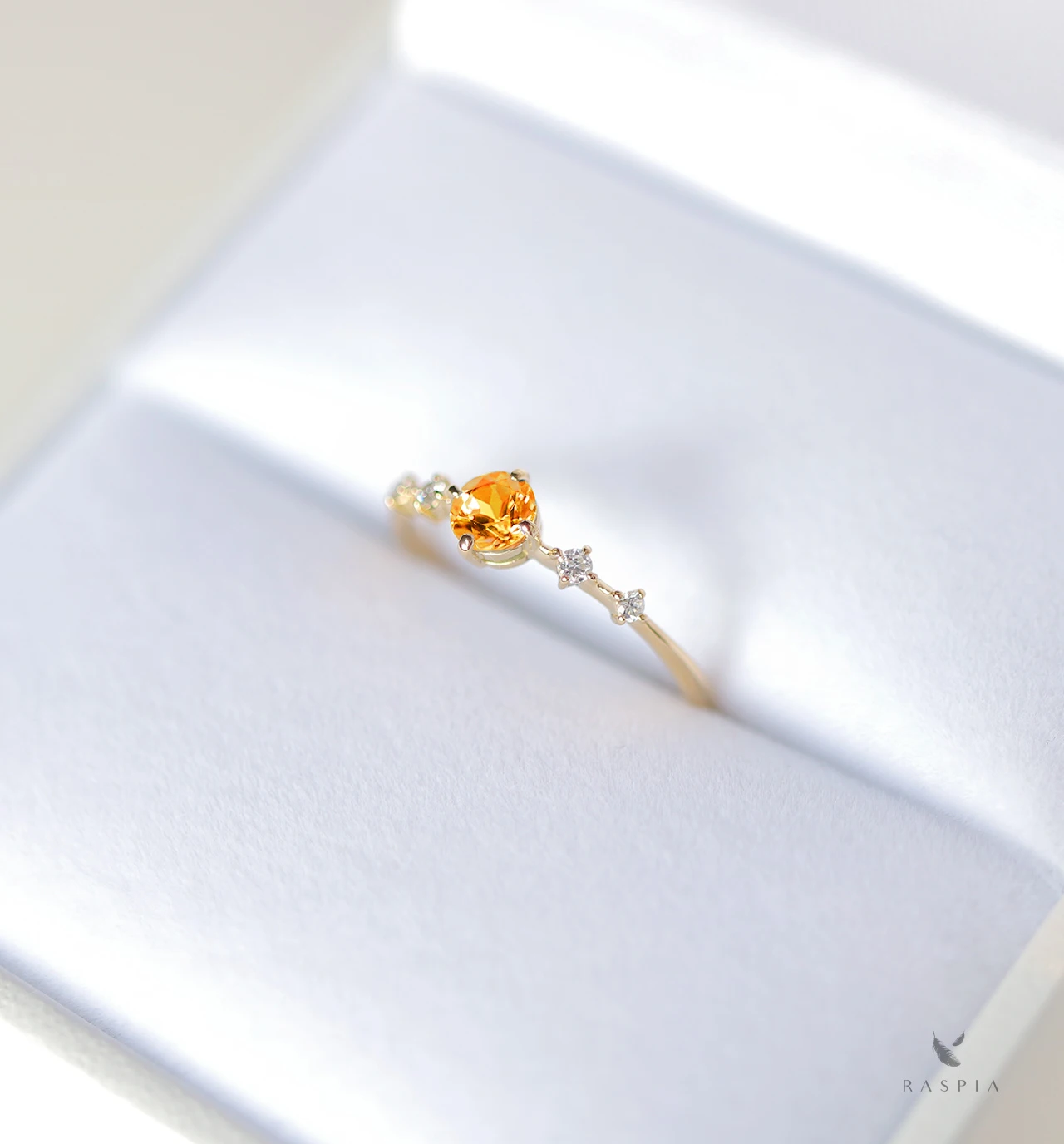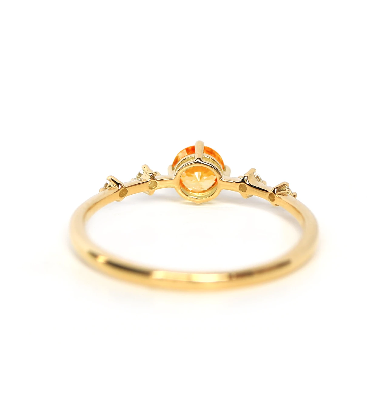 オレンジサファイアのラウンドカットをメインに、4つのメレダイヤを配したK18リングです。鮮やかなオレンジカラーとダイヤモンドの繊細な輝きが、上品に調和したデザインです。