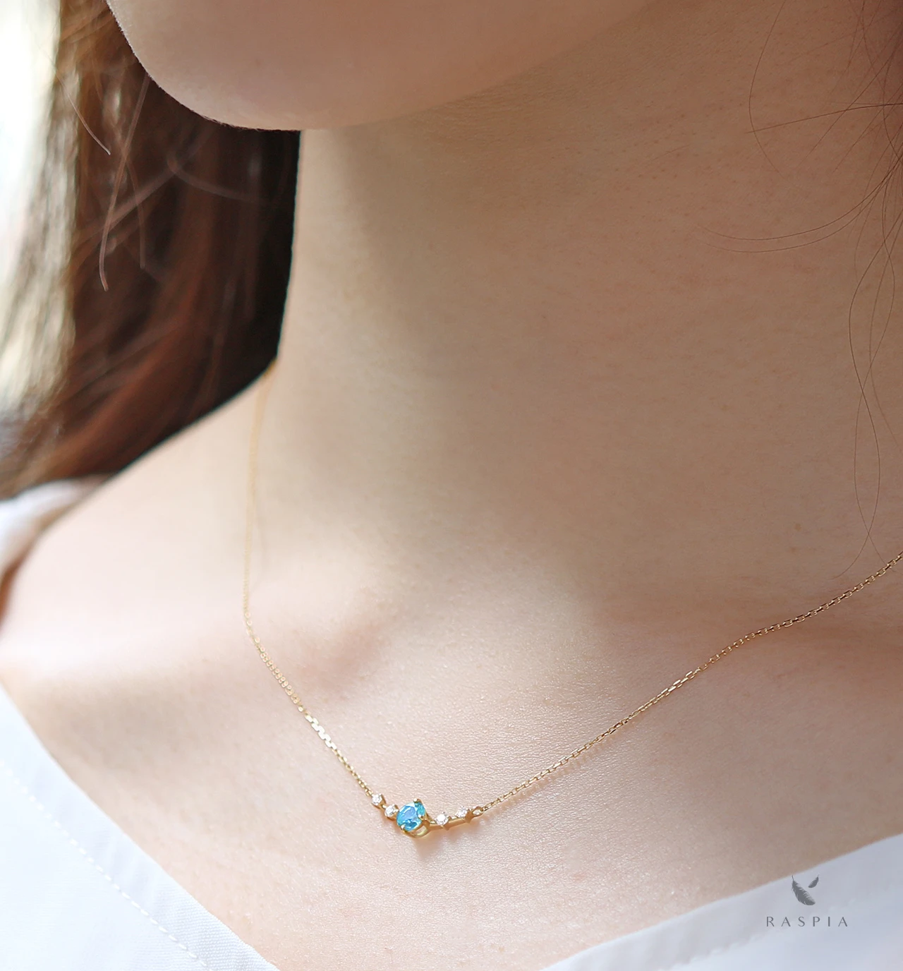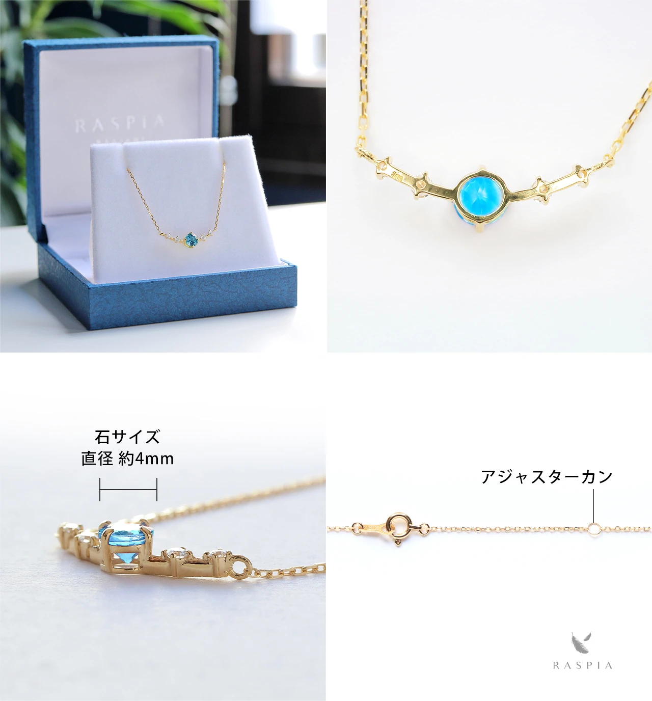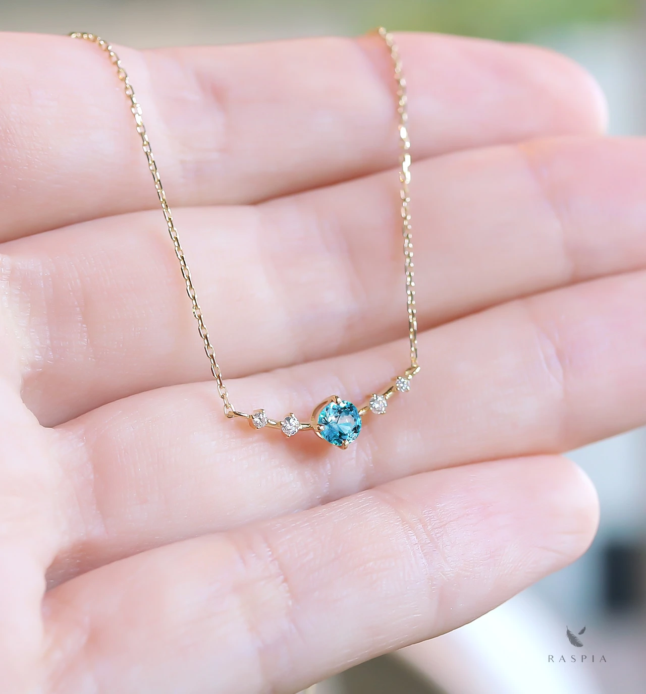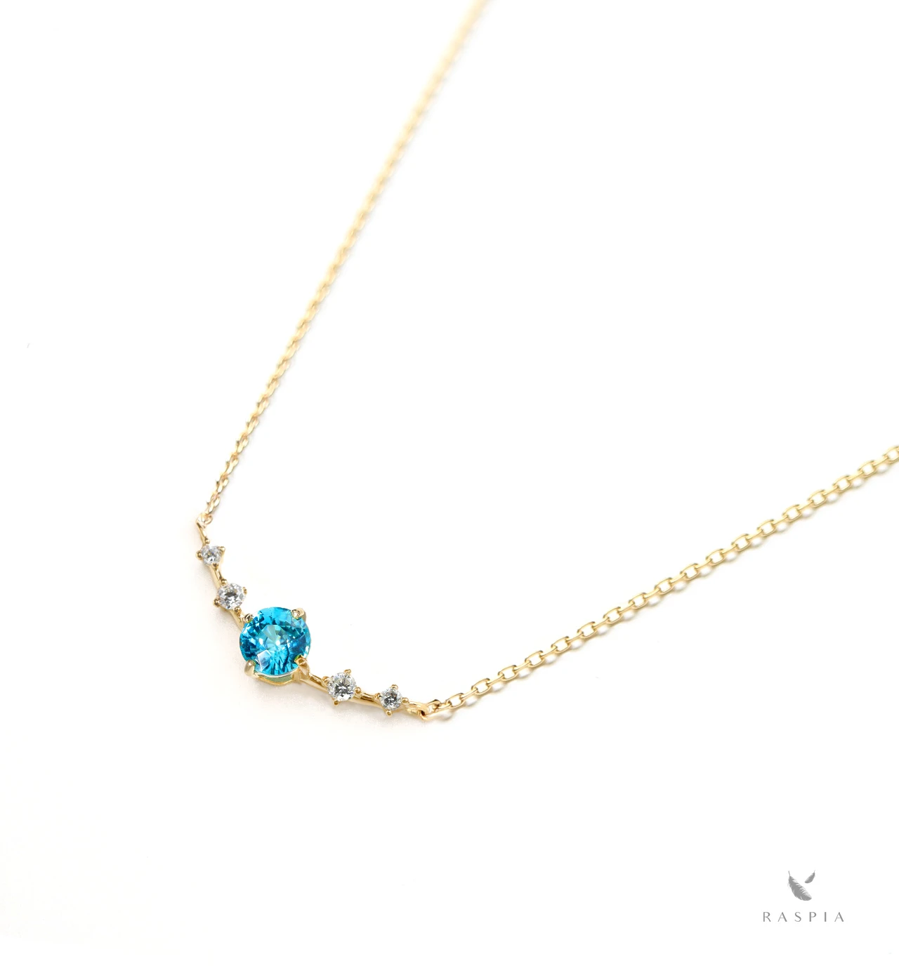 鮮やかなブルーカラーが印象的なブルージルコンを使ったK18ネックレス。ブルージルコンは、アクアマリンやサファイアとは異なる、独特なブルーカラーが魅力です。カラー、カット・研磨の質、透明度など、美しいルースを1粒ずつ厳選して買付しております。