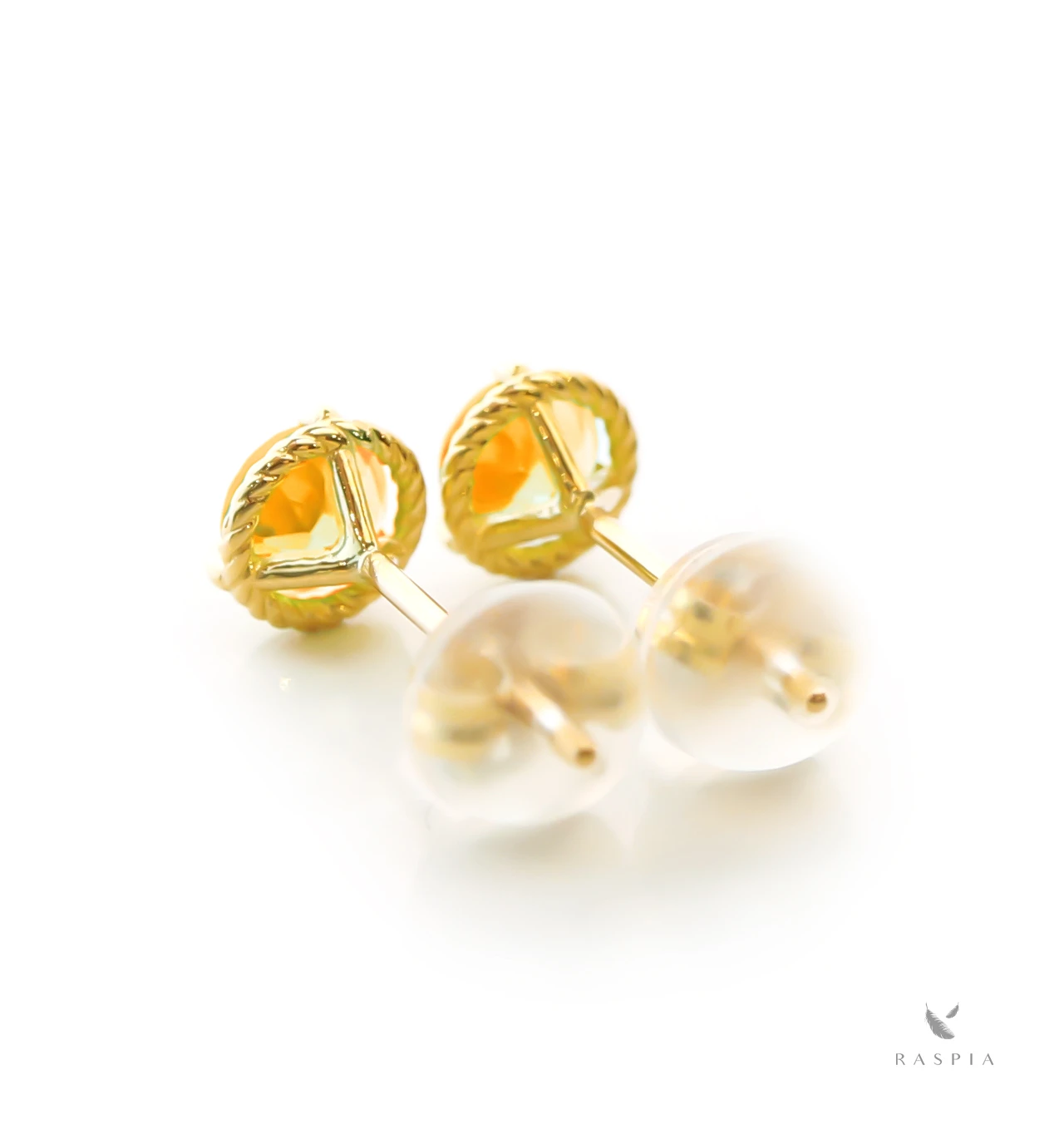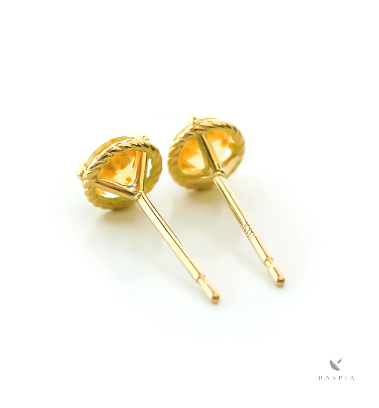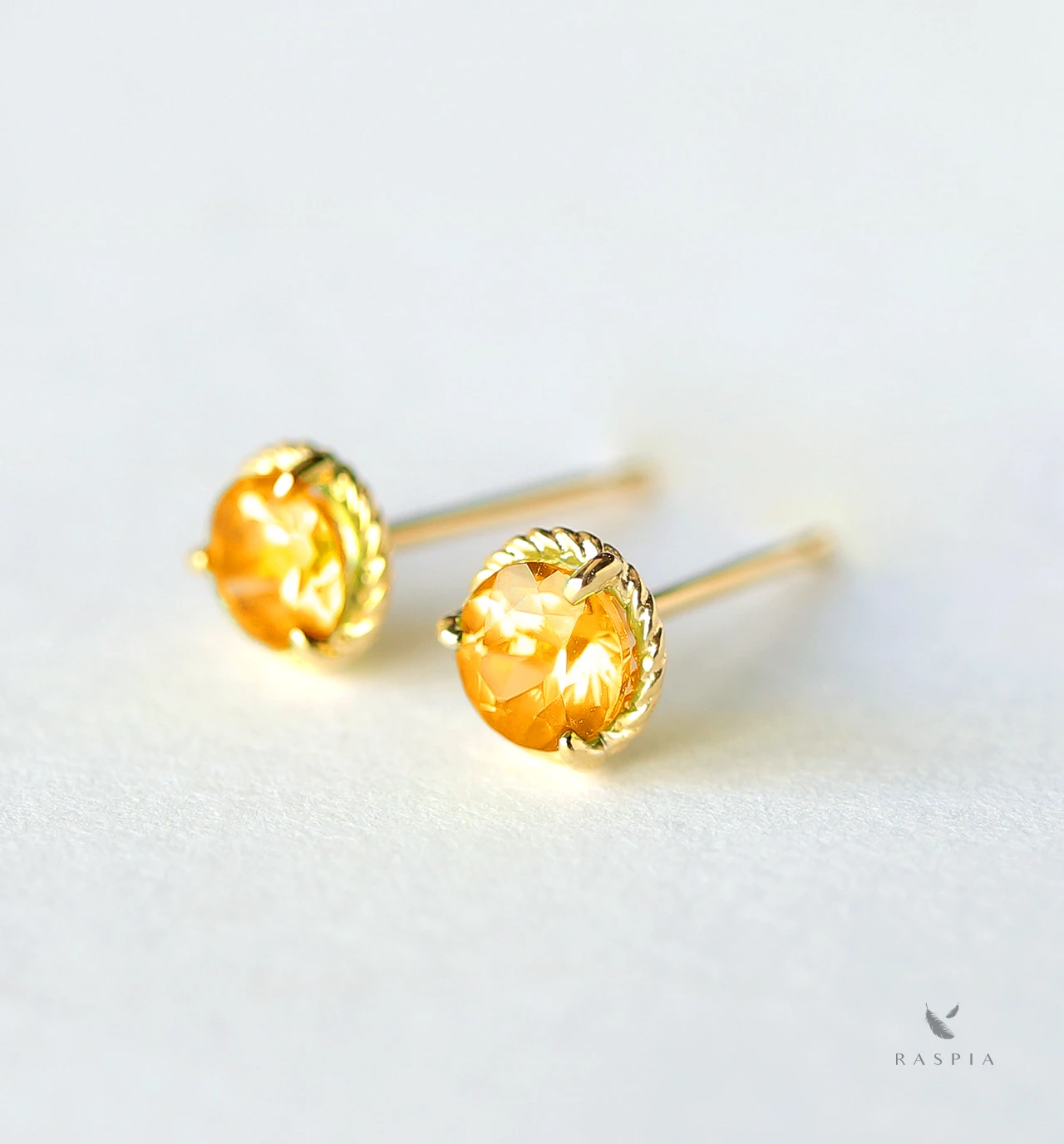 黄金の光をまとったような美しい色味が印象的なシトリン。ラウンドにファセットカットを施したシトリンを10金のヨリ線の縁取りの台座にシンプルなピアスに仕立てました。