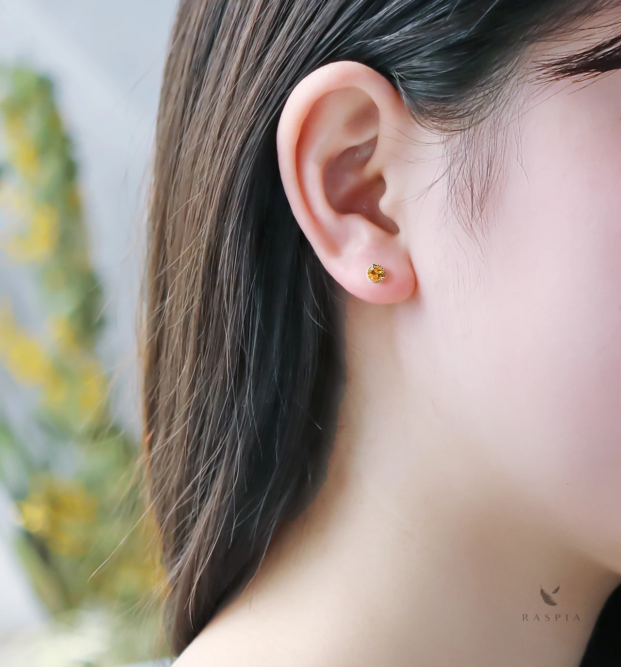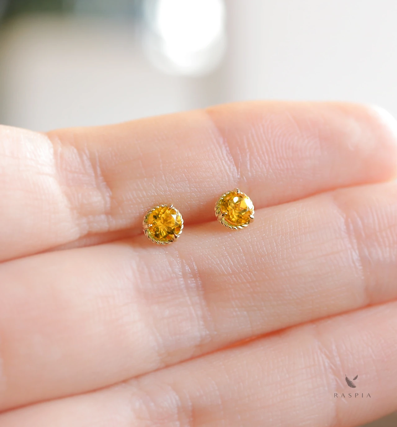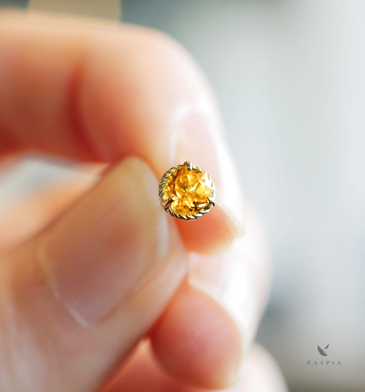 黄金の光をまとったような美しい色味が印象的なシトリン。ラウンドにファセットカットを施したシトリンを10金のヨリ線の縁取りの台座にシンプルなピアスに仕立てました。