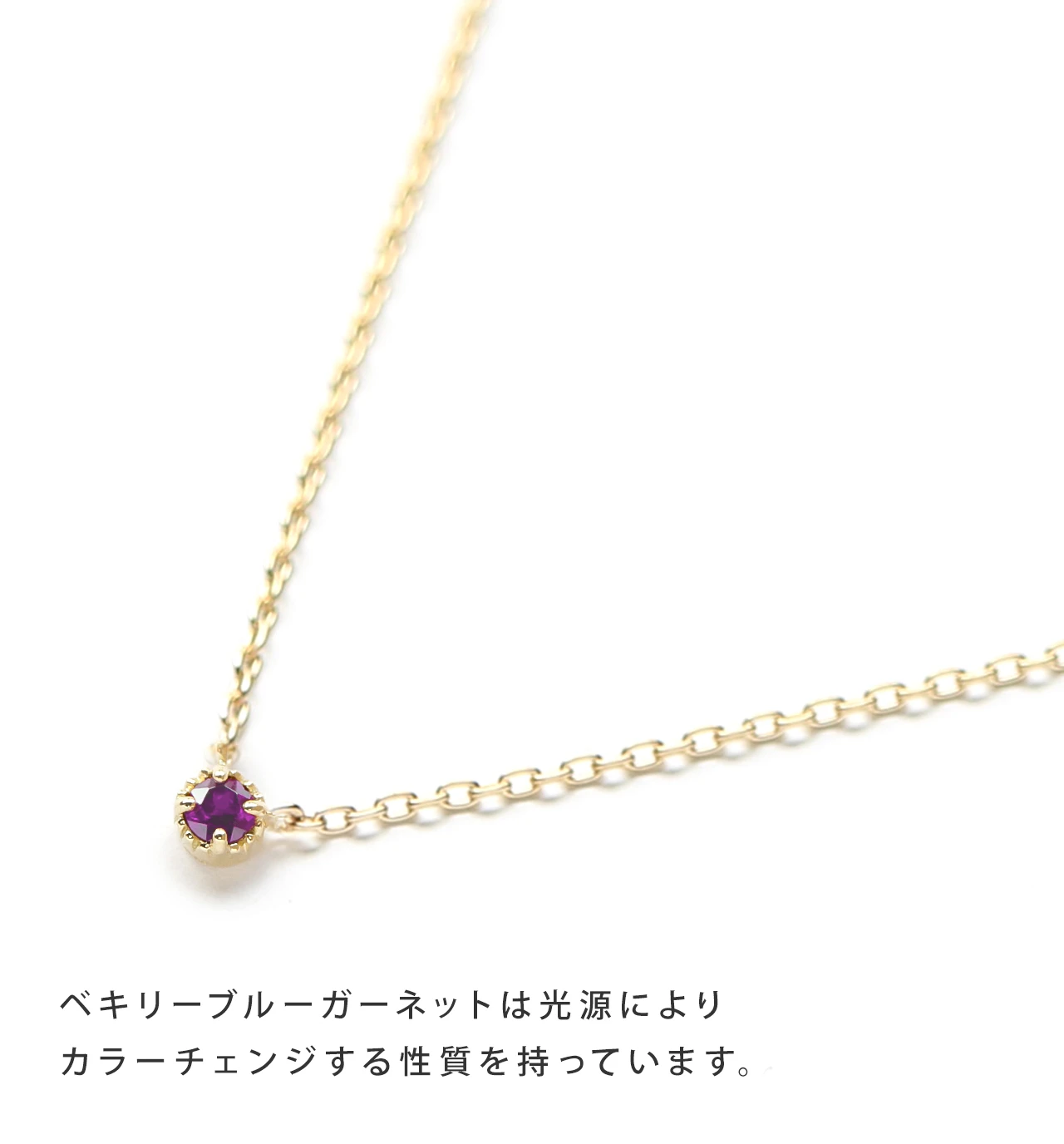 神秘的なブルーカラーの輝きが魅力的な、ベキリーブルーガーネットを使用したシンプルな一粒ネックレスです。これまで存在しないと言われていた「青色」のガーネット。1990年後半に発見され、さらにはカラーチェンジの特性を持つ宝石です。魅惑的なブルーカラーは、ろうそくや白熱灯の下では上品なレッドカラーに変化します。ベキリーブルーガーネットは1月の誕生石です。