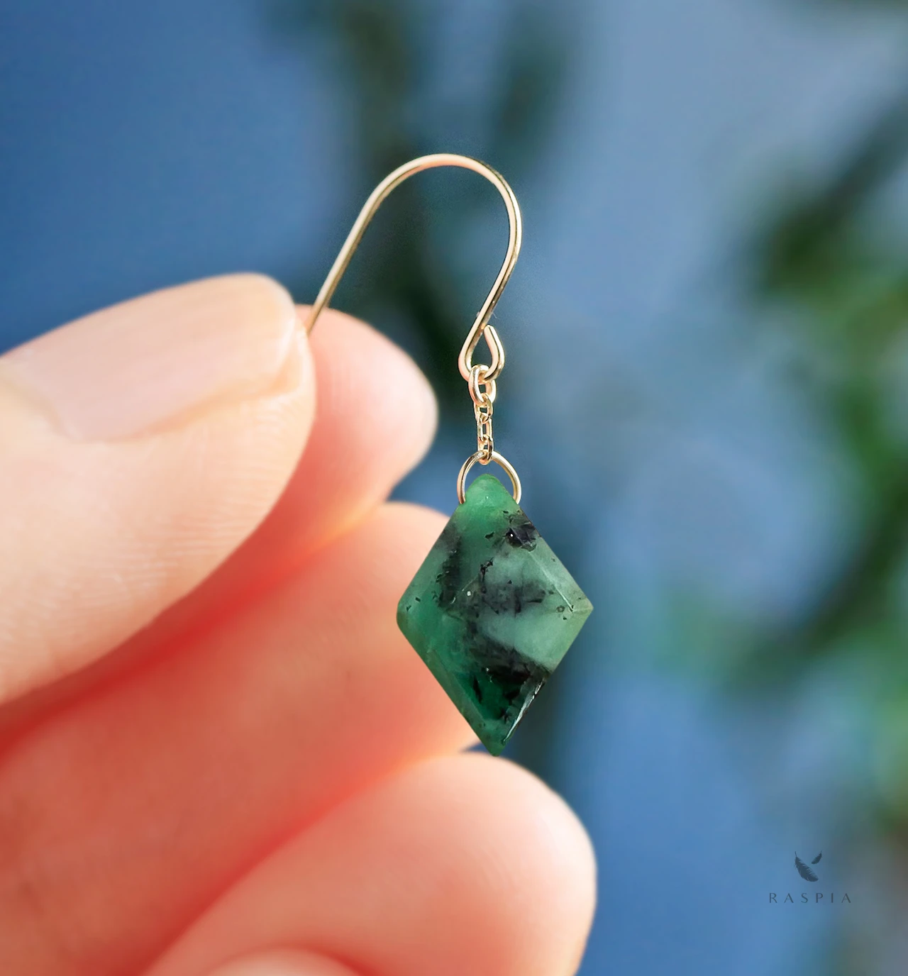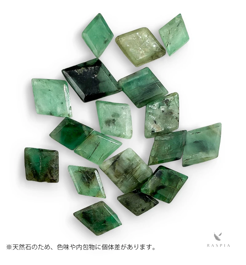 落ち着いたグリーンとダイヤ形のすっきりとしたフォルムが、上品な印象を演出してくれます。天然石ならではの模様や色の濃淡がひとつひとつ異なり、さりげない存在感を放ちます。身につけるだけで装いに自然なアクセントを添えてくれるエメラルドは、特別な贈りものにもぴったり。