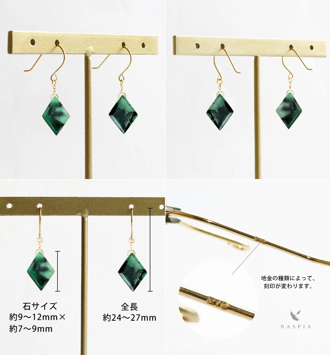 | サイズ | 【ピアス】サイズ:縦 約14mm×横 約10mm フックの太さ 0.5mm【石】エメラルド:縦 約9~12mm × 横 約7~9mm | ||