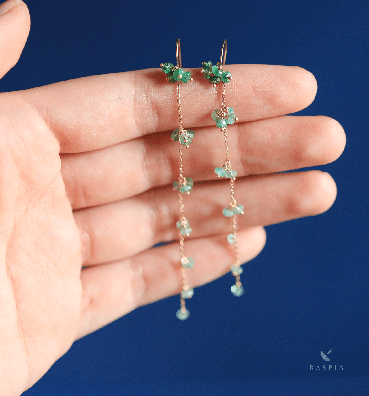 エメラルドを贅沢に使用した、ロングチェーンのK10フックピアスです。