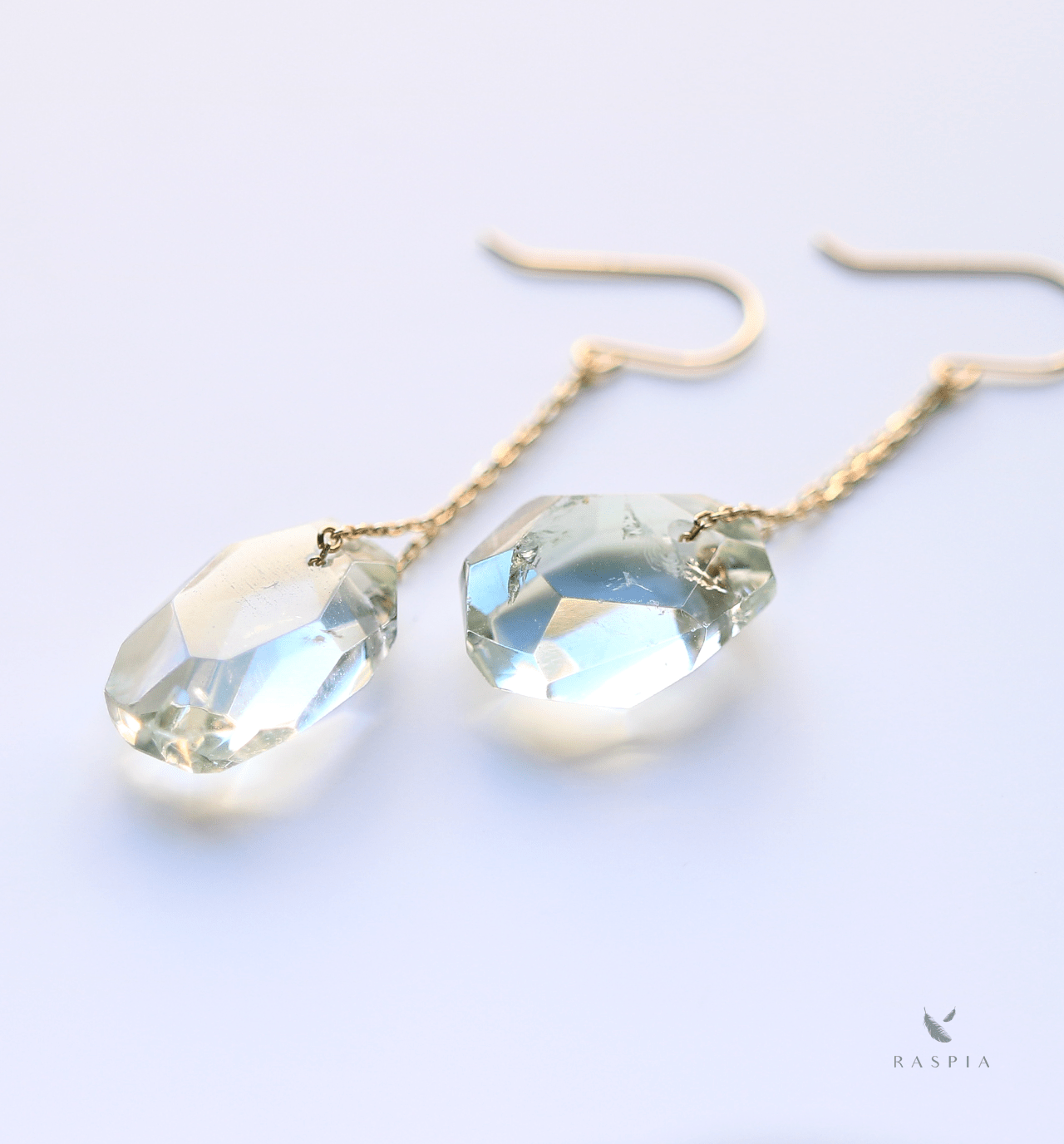 澄んだ湖水のような透明感が印象的な、大粒のグリーンアメジストを使用したK10フックピアスです。