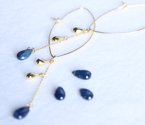 イエローゴールドの雫が伝い落ちた先に揺れて光るサファイアの青をより際立たせてくれます。 キラキラのフープはマーキスシェイプに仕上げてあり、流れるような一体感と美しさを感じさせます。