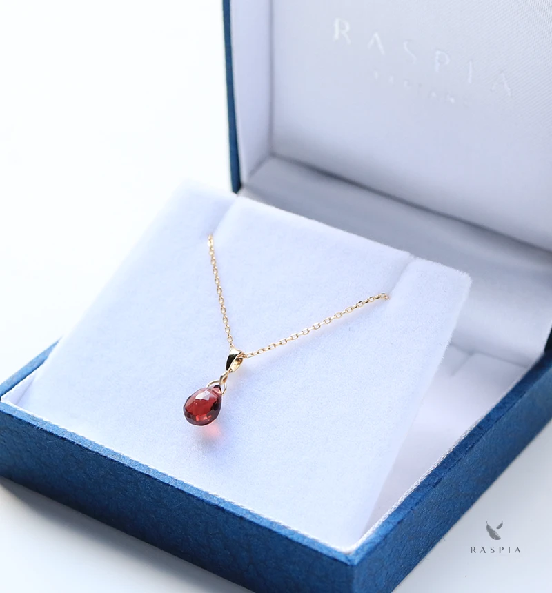 平ドロップのアルマンディンガーネットが胸元で確かな存在感を放ちます。金具は石の存在を引き立てるサイズ感にこだわりました。また、身体の動きに合わせ石が揺れてきらめき、それでいて石がいつも正面を向くように絶妙なバランス調整を施しています。