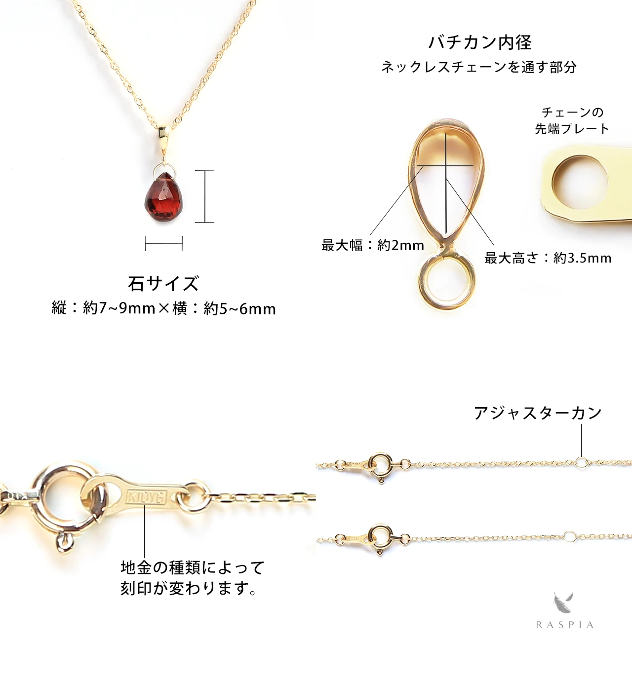 | サイズ | アルマンディンガーネット:縦 約7~9mm × 横 約5~6mm バチカン内径:高さ 最大(約)3.5mm/幅 最大(約)2mm チェーン全長は40cm・45cm・50cmよりお選びいただけます。 | ||