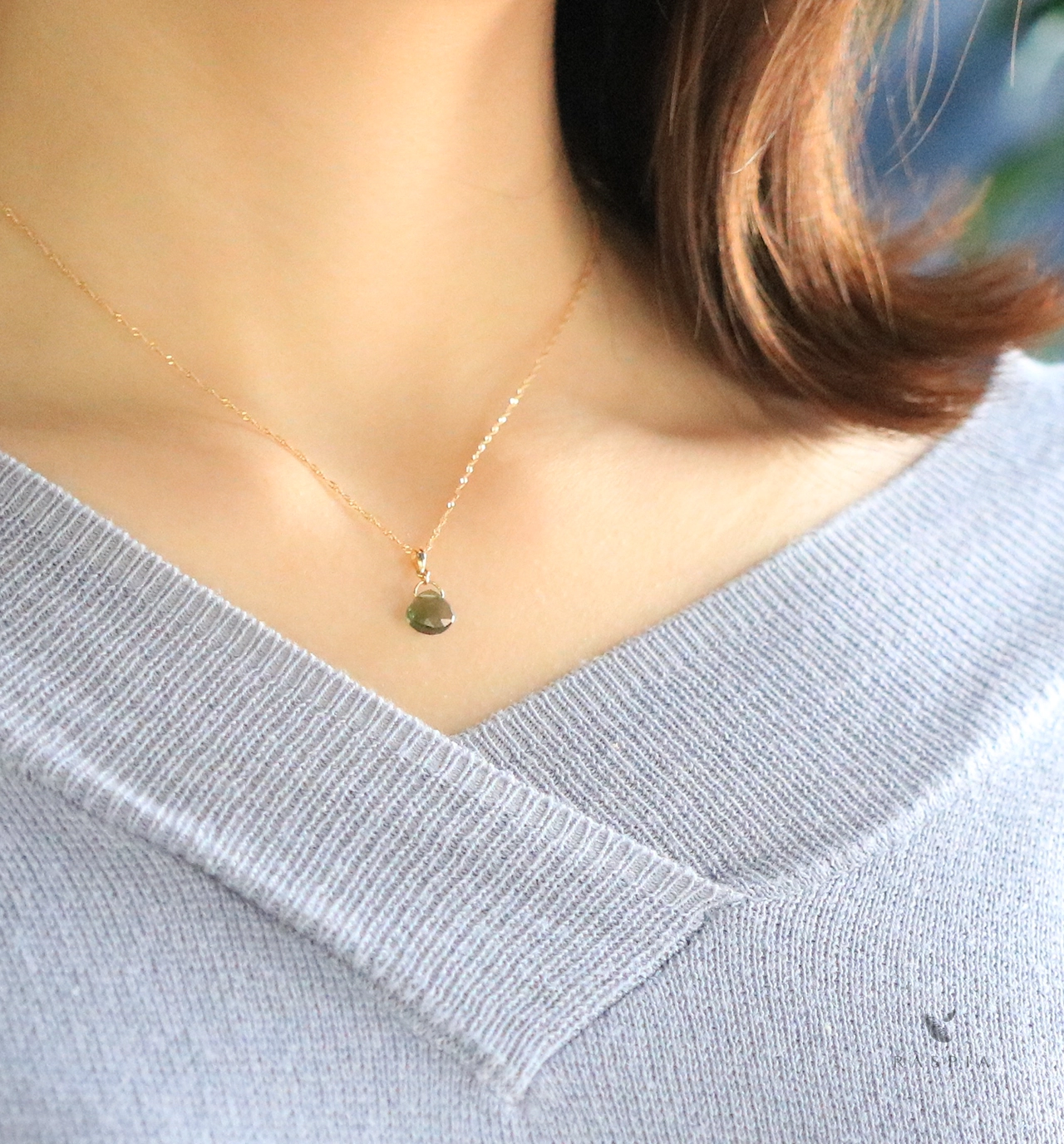 マロンカットのモルダバイトが胸元で確かな存在感を放ちます。金具は石の存在を引き立てるサイズ感にこだわりました。また、身体の動きに合わせ石が揺れてきらめき、それでいて石がいつも正面を向くように絶妙なバランス調整を施しています。
