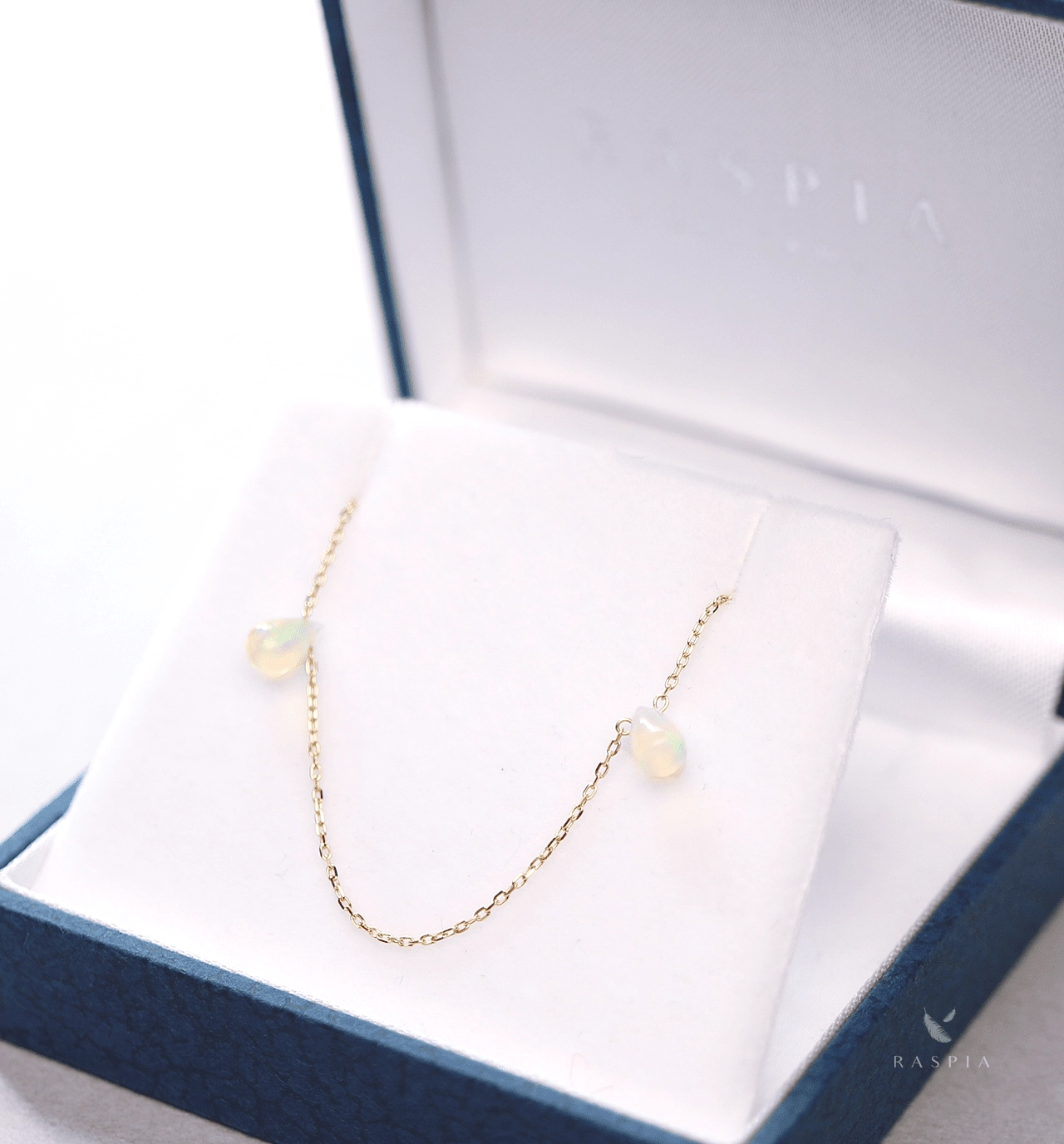 あずきチェーンに4石のオパールがついた特別なネックレスが、デコルテを飾ります。