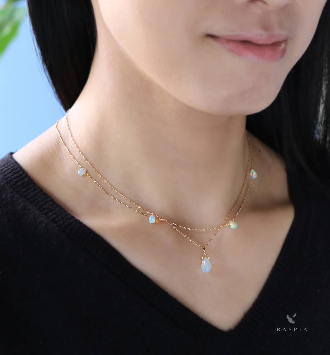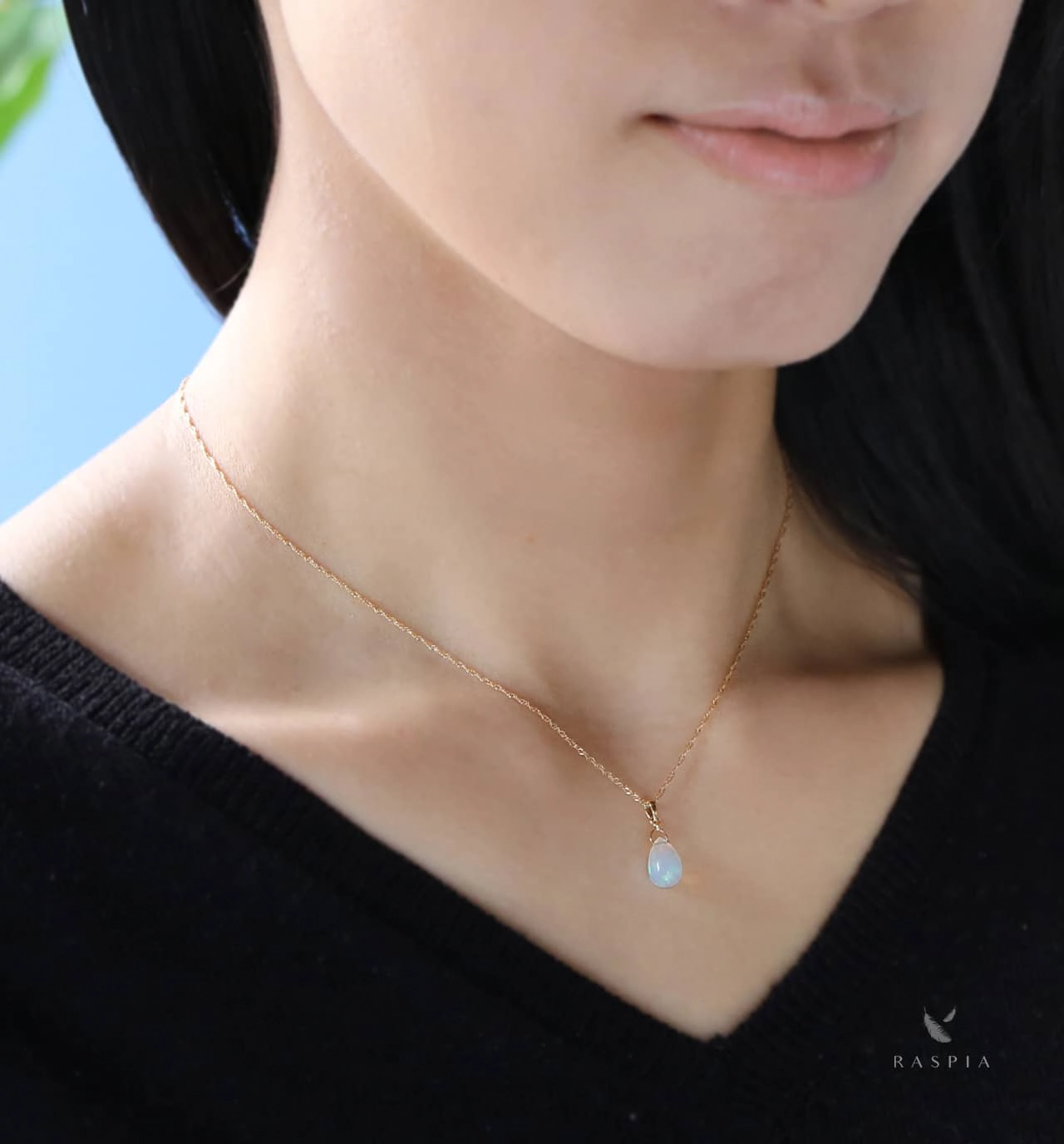 遊色効果が神秘的なウォーターオパールが胸元で確かな存在感を放ちます。金具は石の存在を引き立てるサイズ感にこだわりました。また、身体の動きに合わせ石が揺れてきらめき、それでいて石がいつも正面を向くように絶妙なバランス調整を施しています。