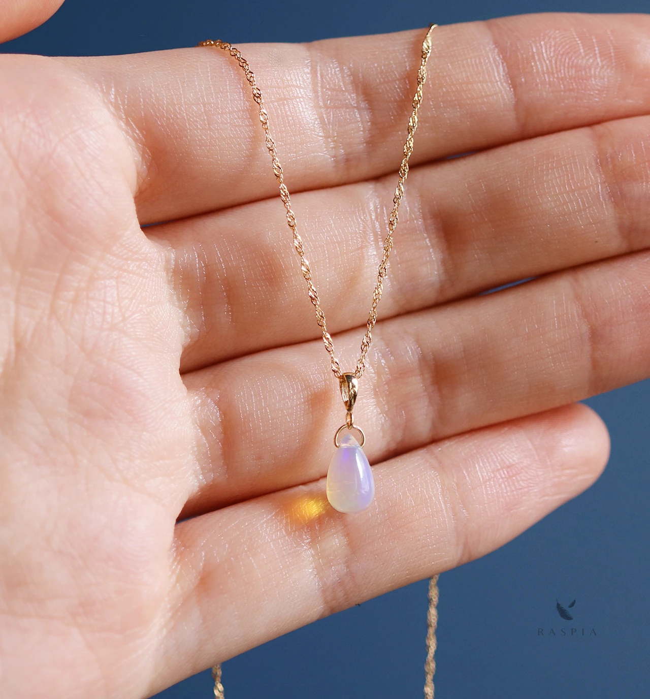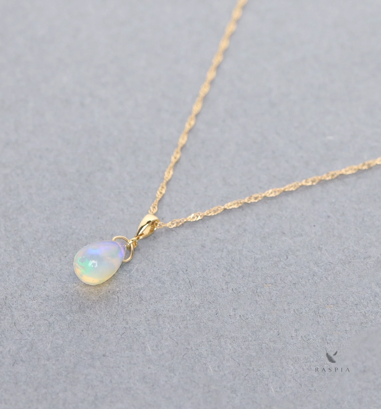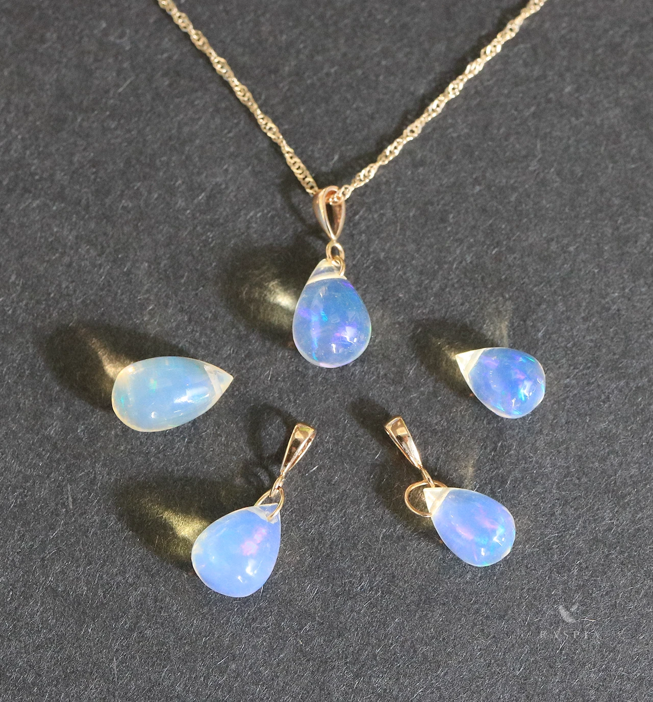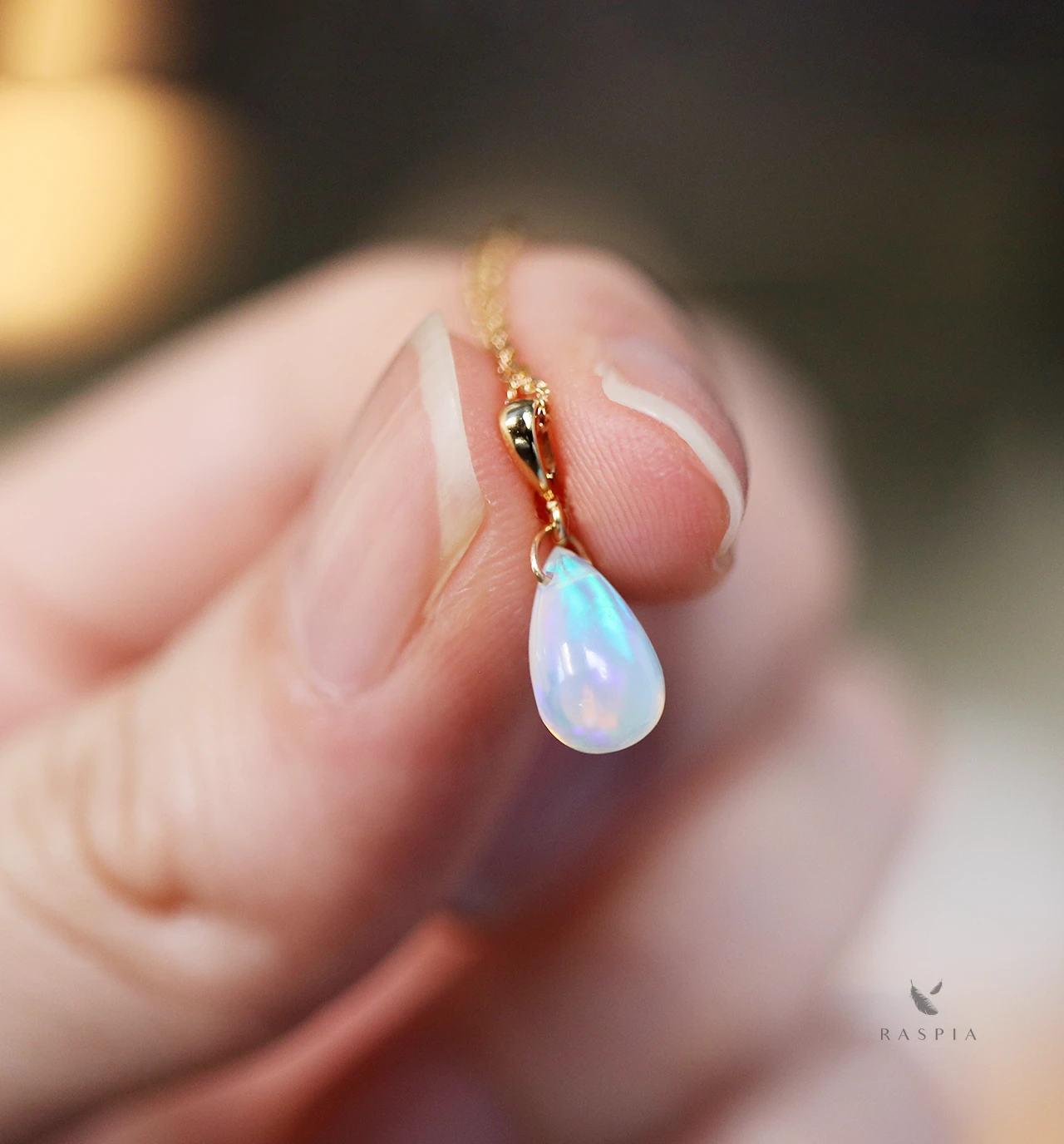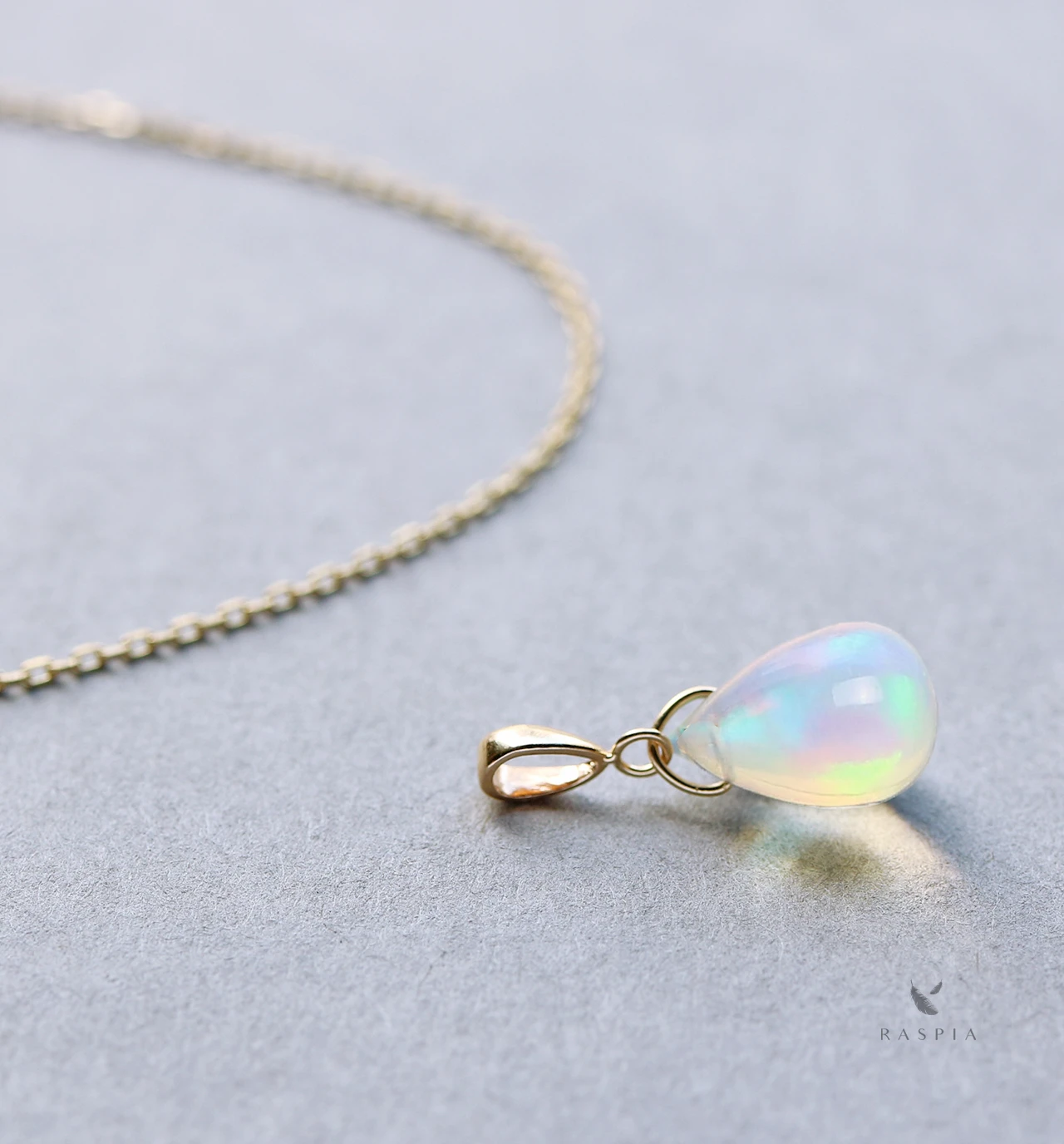 水を閉じ込めたような透き通る石と虹のような遊色効果が神秘的なウォーターオパールのK10ネックレスチャームです。