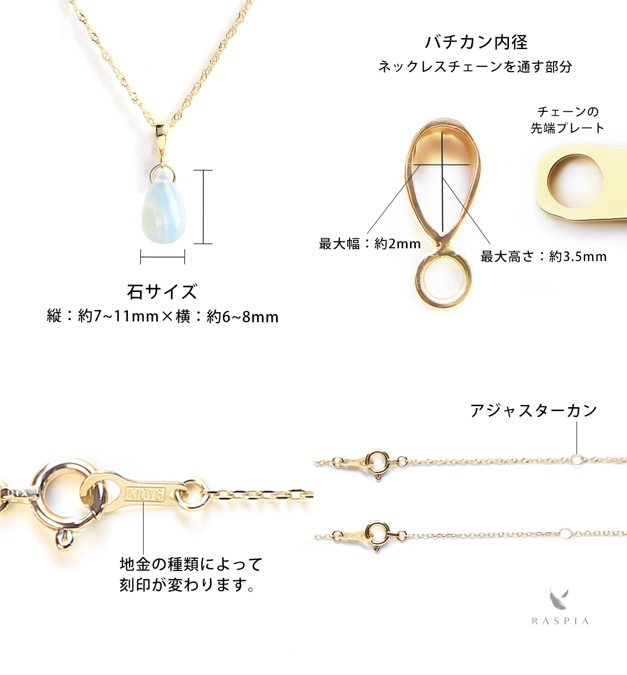 | サイズ | オパール:縦 約7~11mm × 横 約6~8mm バチカン内径:高さ 最大(約)3.5mm/幅 最大(約)2mm チェーン全長は40cm・45cm・50cmよりお選びいただけます。 | ||