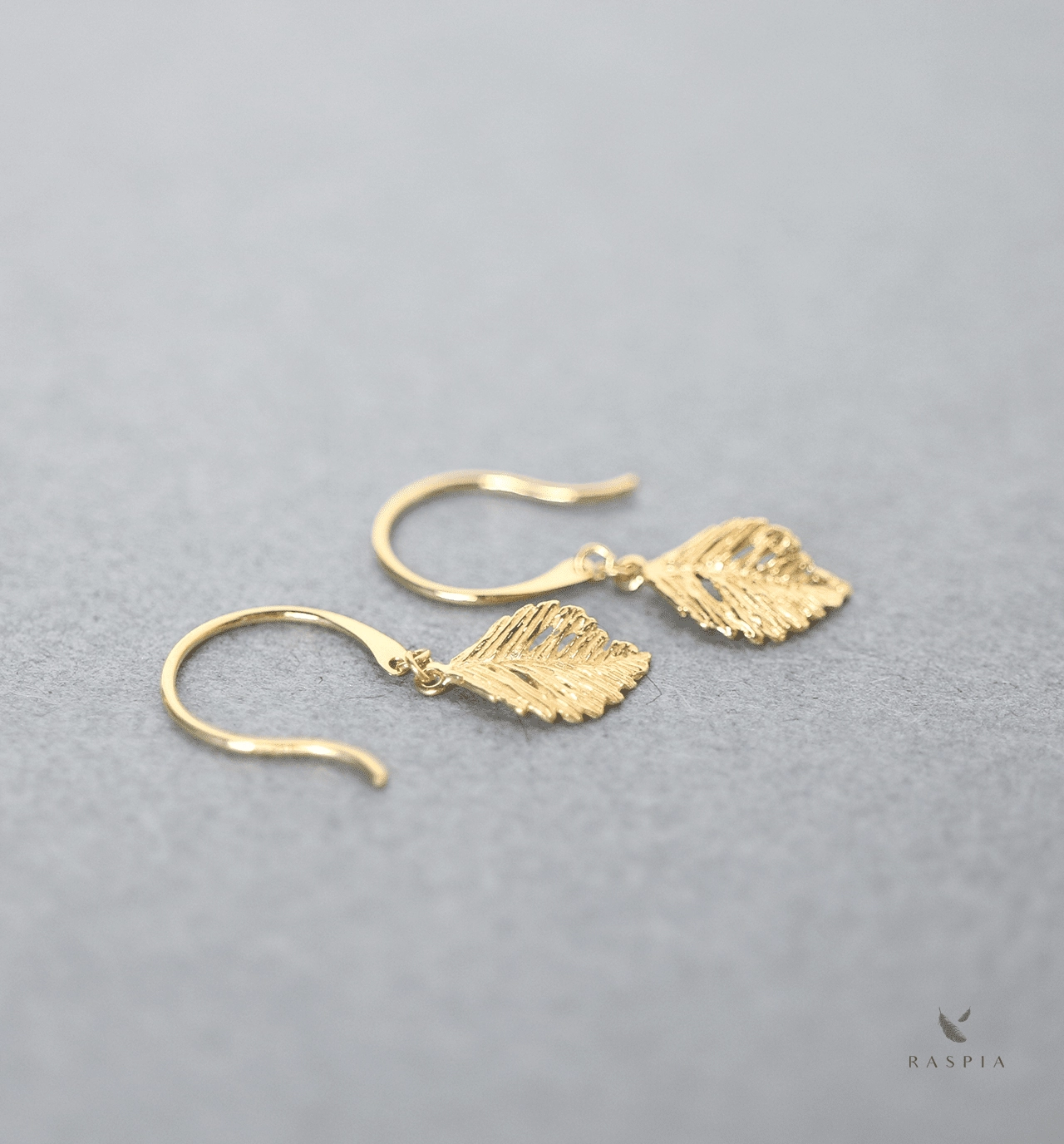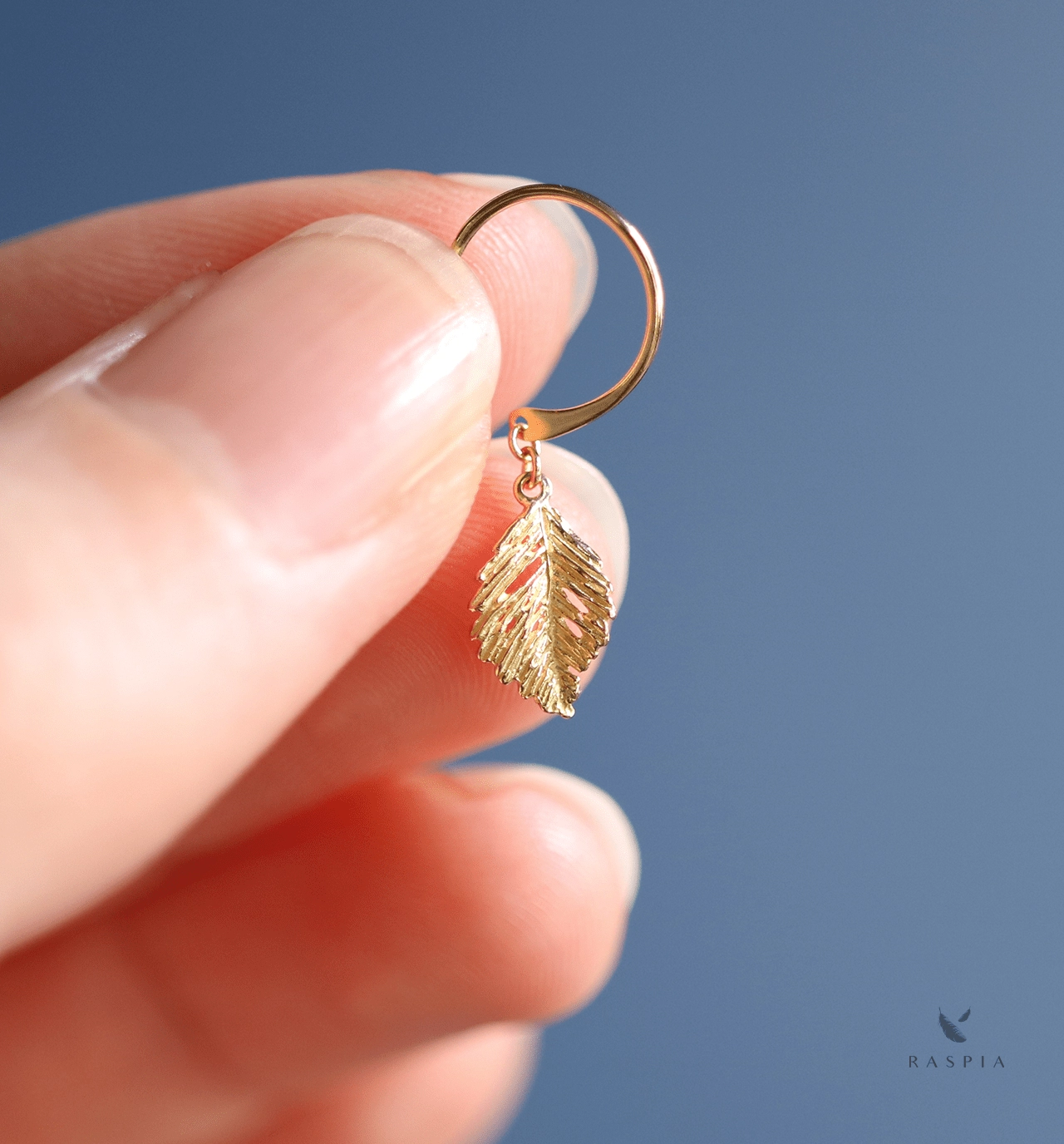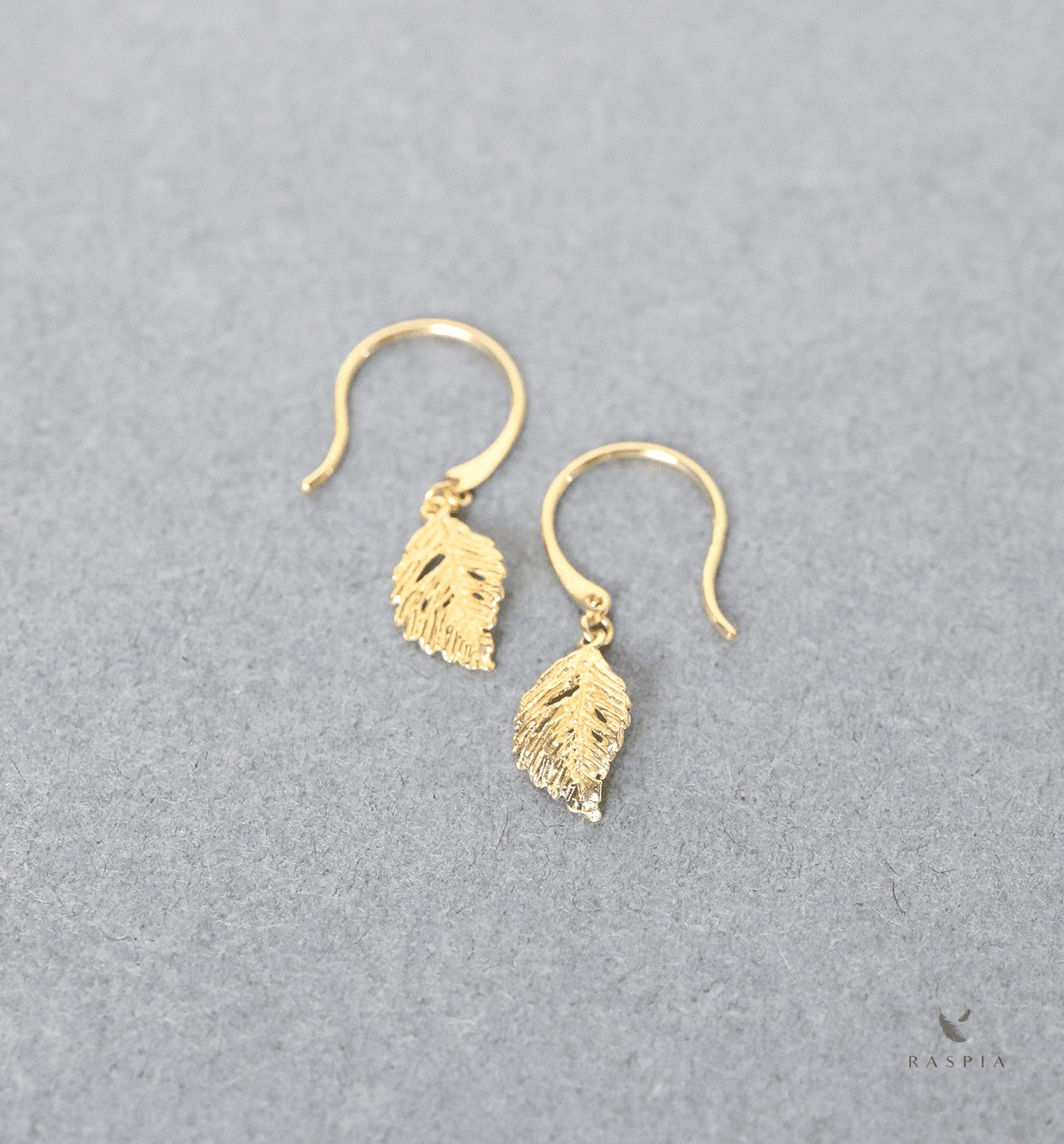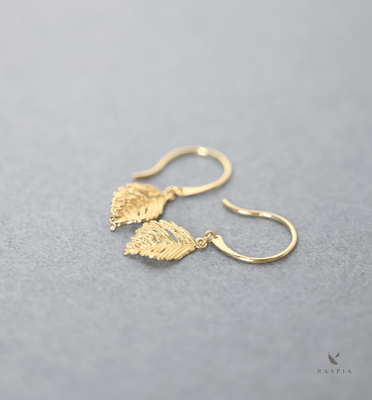 彫りや透かしが魅力的な金の葉のチャームをあしらった繊細なフックピアス。