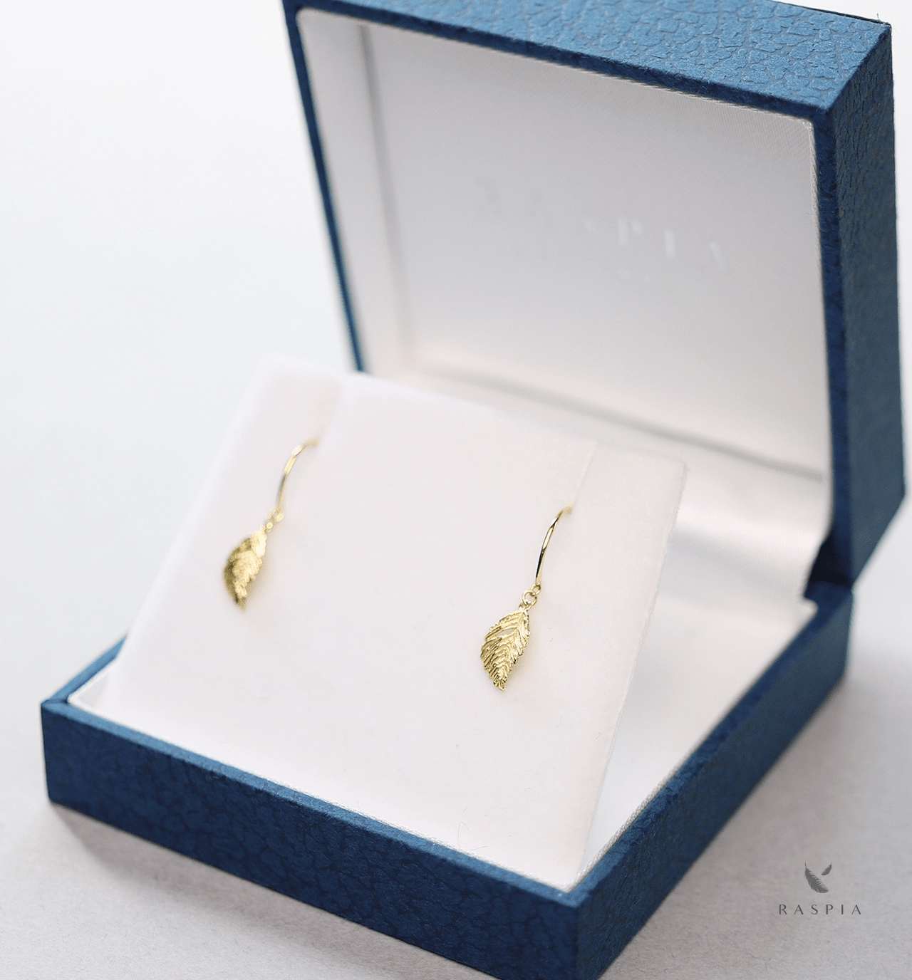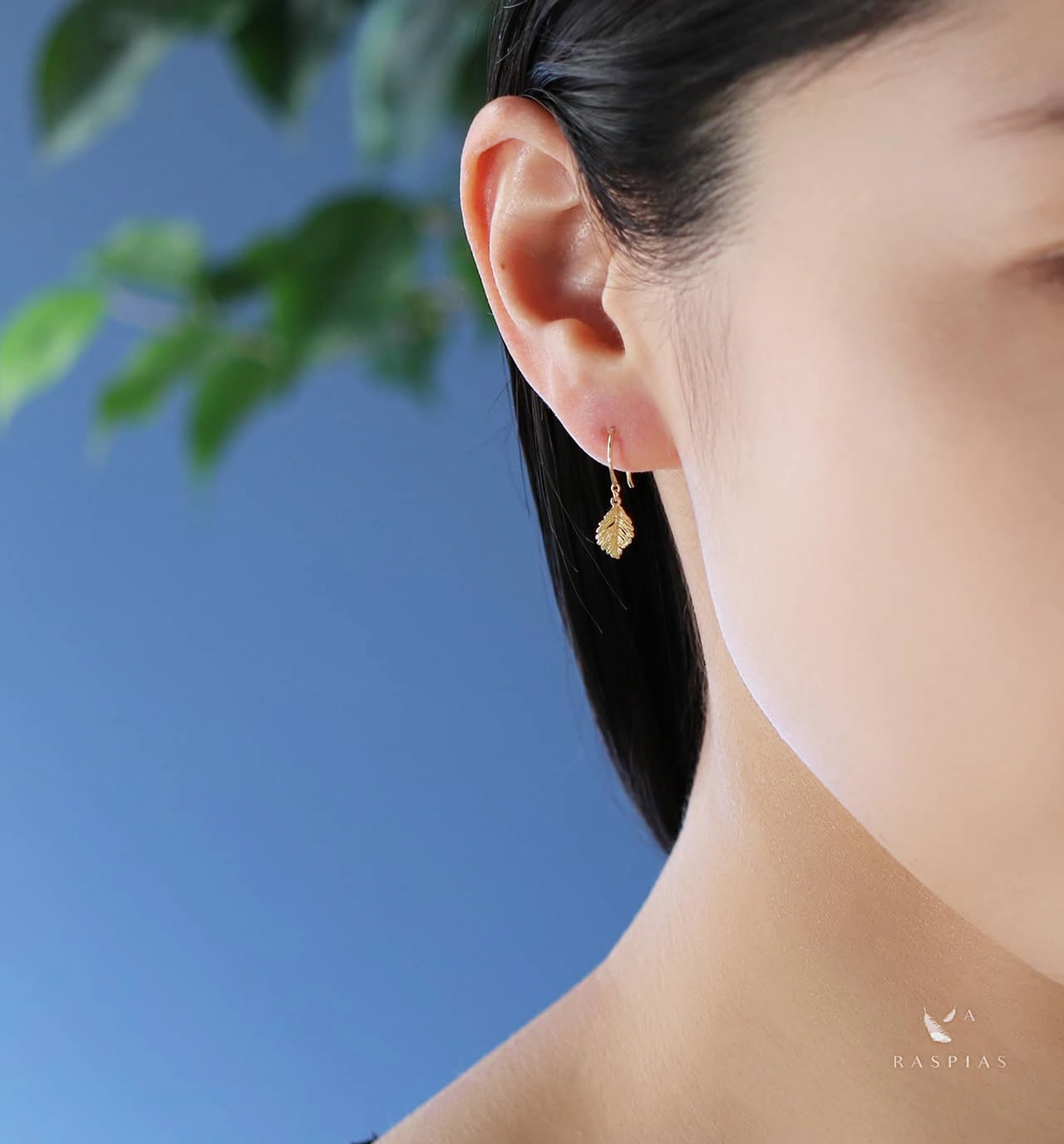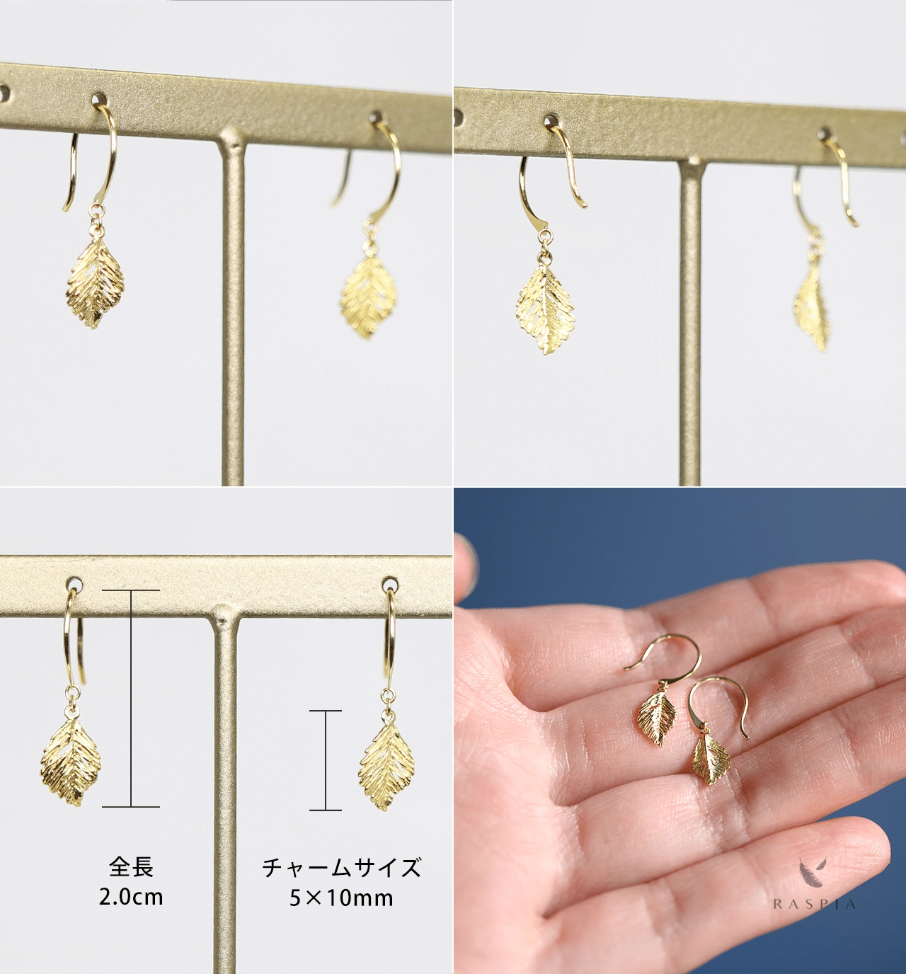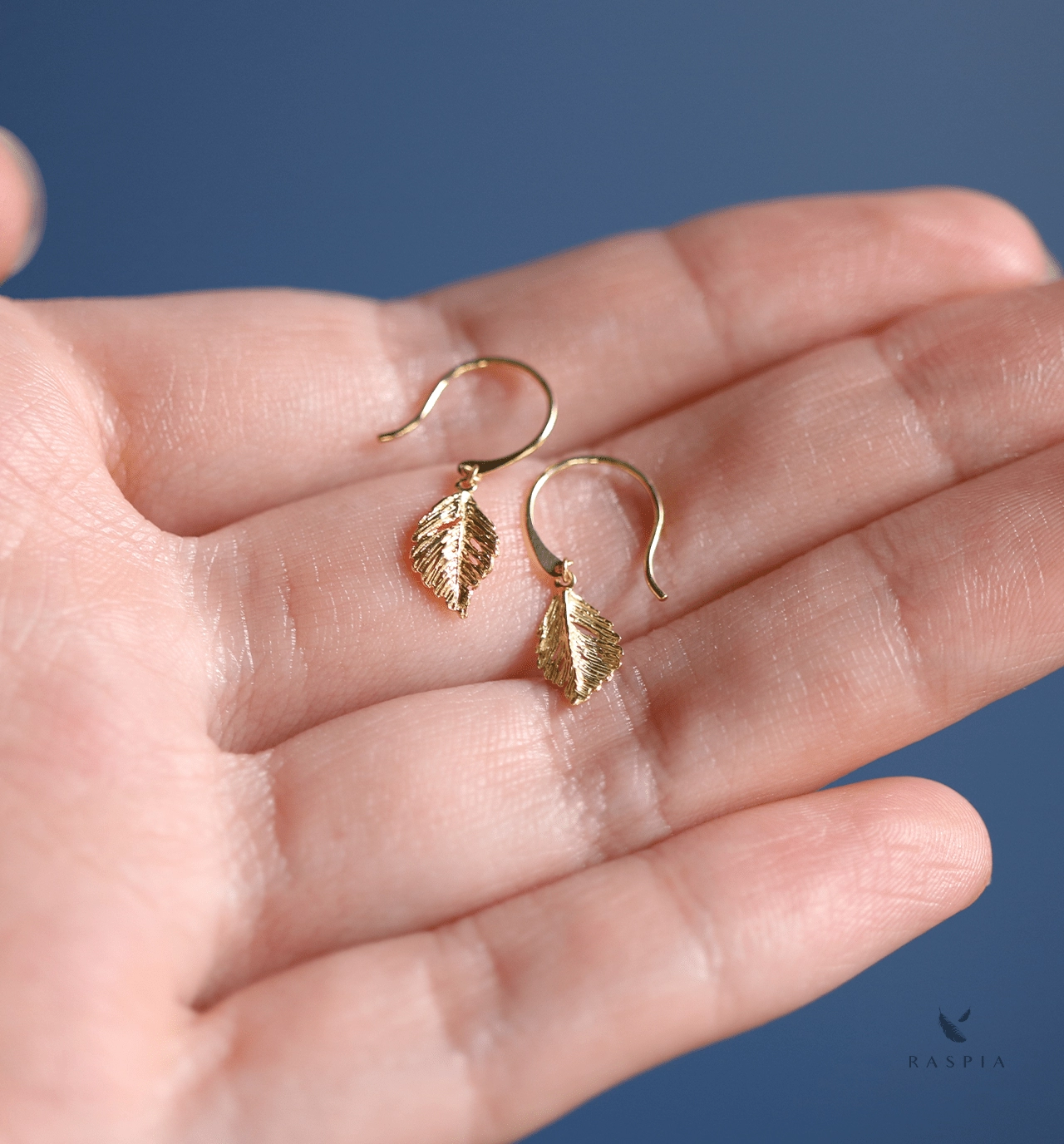 彫りや透かしが魅力的な金の葉のチャームをあしらった繊細なフックピアス。