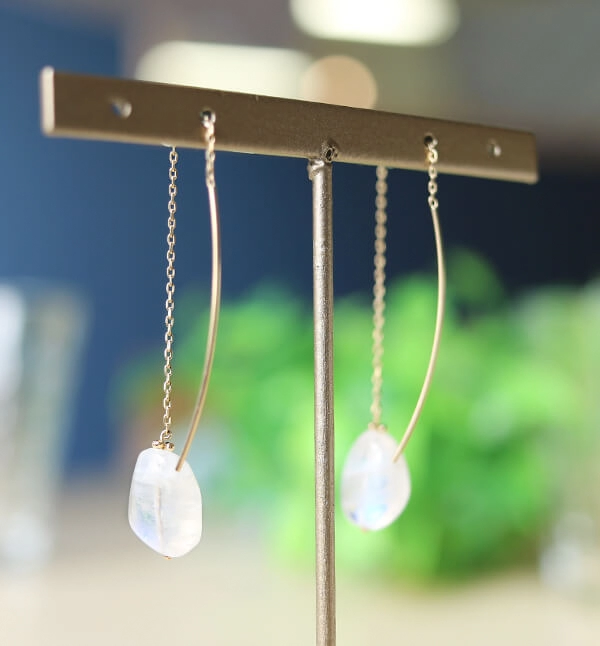 月の光を宿した石ムーンストーンのタンブルを使用したピアス。