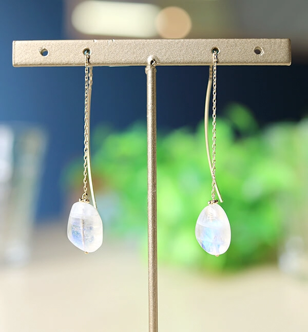 | サイズ | 全長:約9.5cm(石の大きさにより長さは変動) ムーンストーン:最小7×9 〜 最大9×12mm ポストの太さ:0.8mm | ||